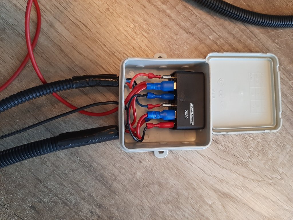 Dus hier het resultaat van twee uurtjes knutselen: Het meest lastige was nog om de male H4 connector te maken, daarna was het alleen nog maar draad op maat knippen en aansluiten.