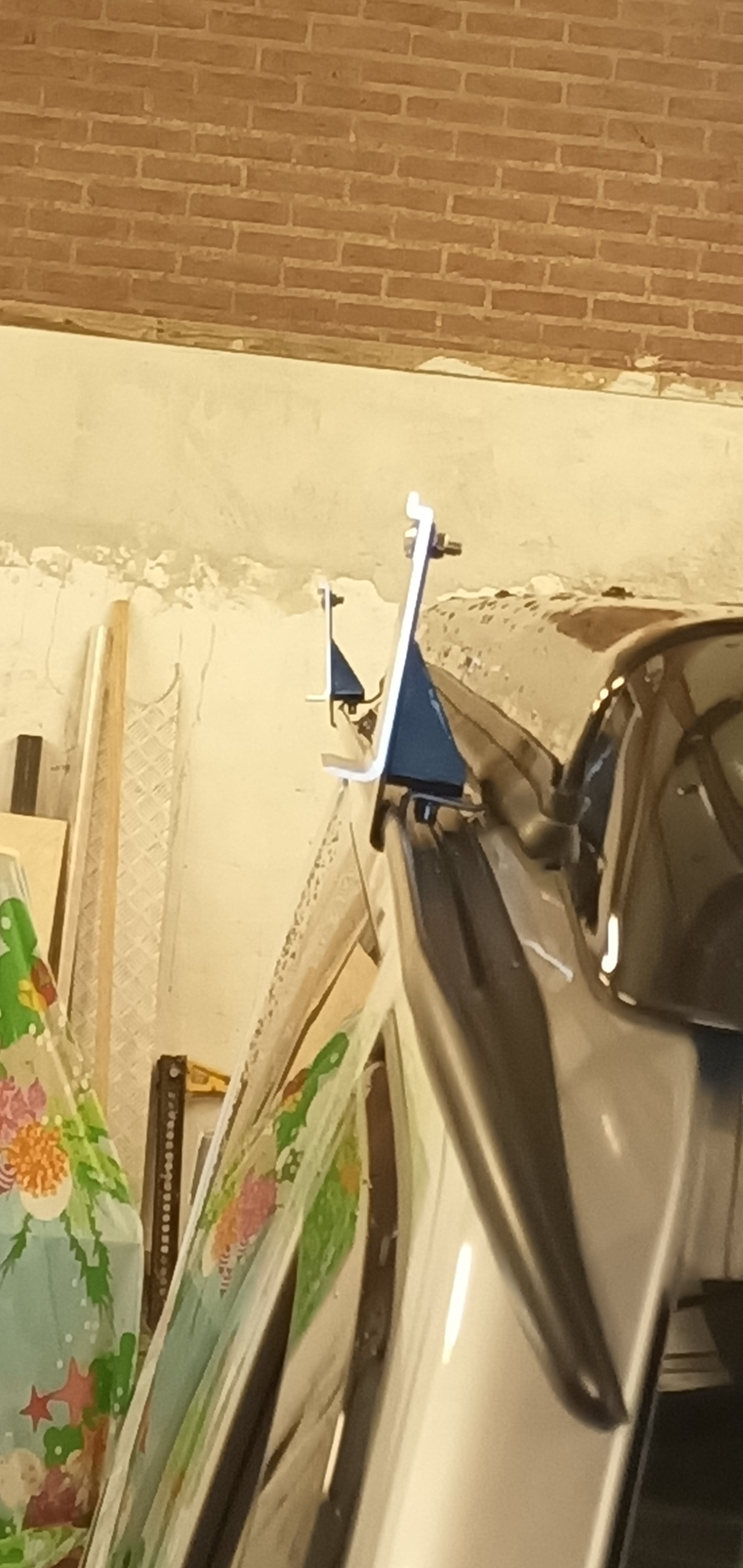 Ik kan de beugel aan de voorzijde vrij simpel naar voren laten hellen maar dan moet ik opvullingen tussen het dak en de beugel doen maar dan sluit het heffak niet meer. Dus dat is geen oplossing.