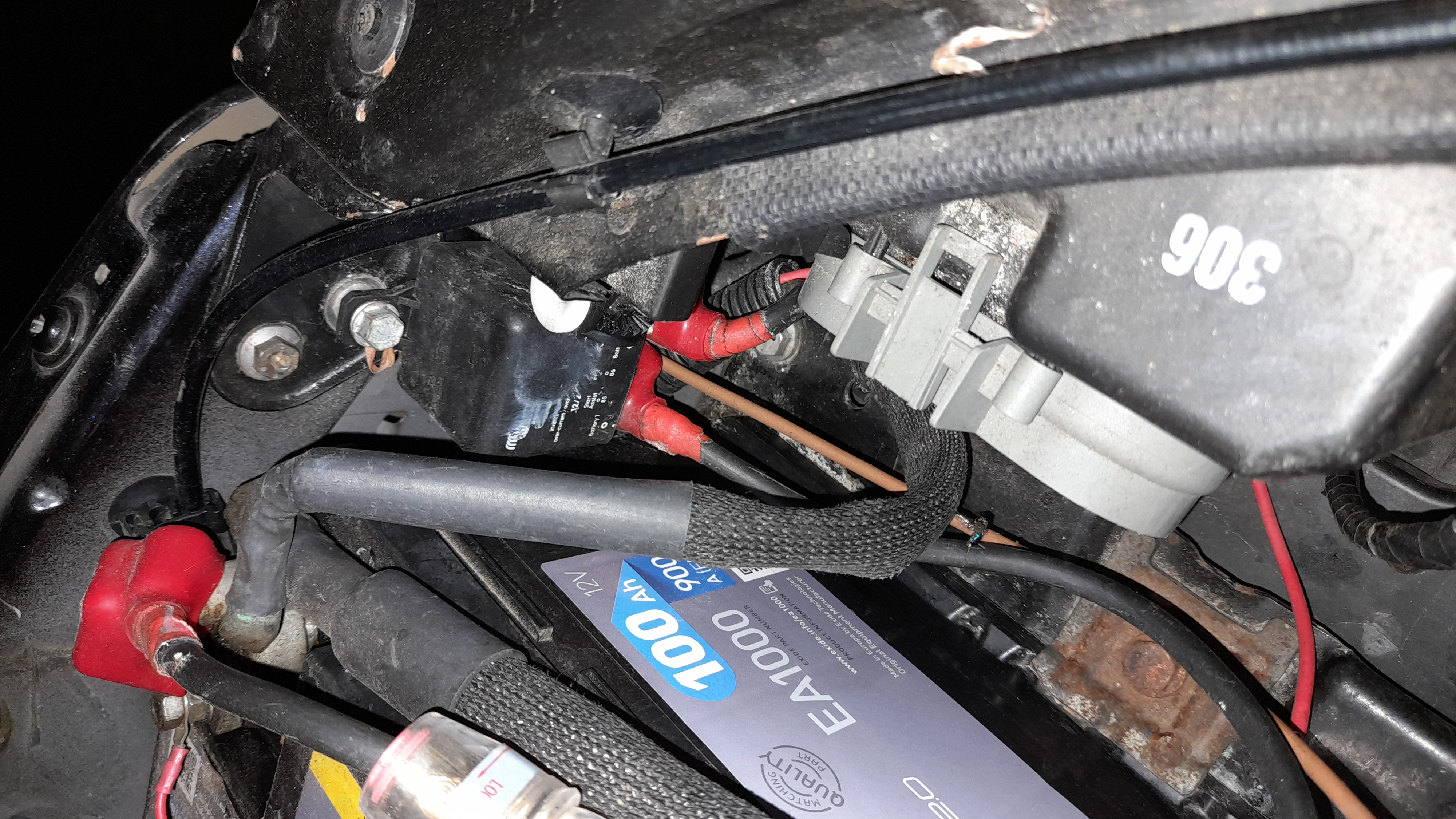 Ik heb het zelfde relais links van de accu (vanuit de auto gezien) tegen het linker binnenscherm. Daar zit een m6 boutje waar hij bij onder kan en dan kun je de de kabel recht naar achteren voeren door de rubberplug in het schutbord de cabine in en onder de mat door naar de huishoud accu.