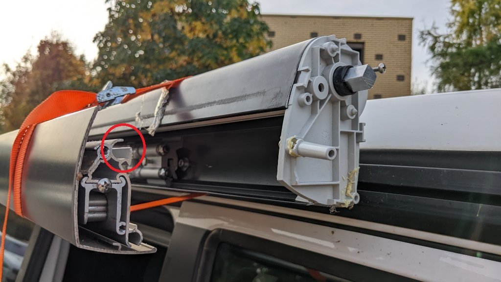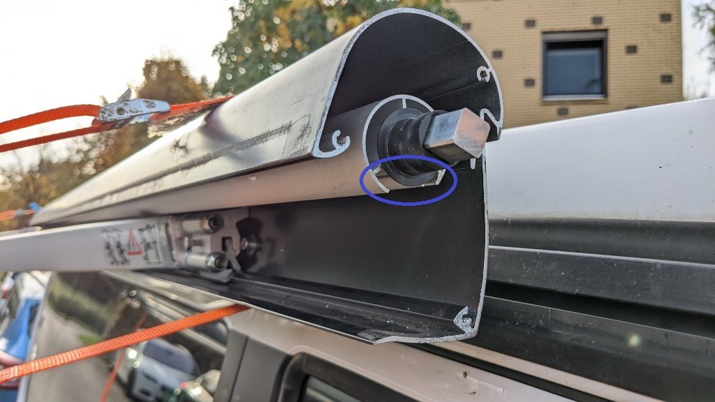 Het doek heeft aan het ene einde een pees, die in het bewegende deel moet (foto hierboven, rood omcirkeld), en aan het andere eind een aluminium strip, die in de rol (foto hieronder, blauw omcirkeld) geschoven wordt.