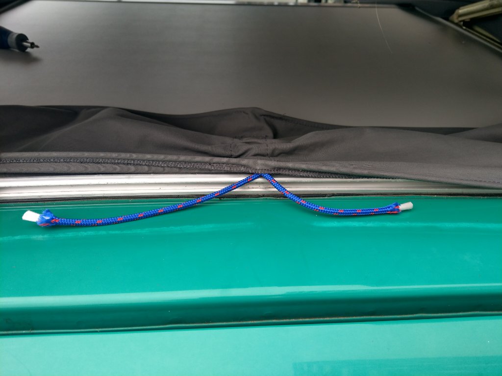 Na contact gehad te hebben met Poptopshop is de installatie helemaal over gedaan. Ze raadden me aan om met de hoeken voorin de bus te beginnen en dan naar achter te werken. Hierdoor werkt een deel van het overtollige touw, dat zich aan de achterkant bevind, zich naar binnen. Horizontaal staat het doek nu ontspannen, waardoor het in verticale richting wel uitgerekt kan worden. En dit werkte als een trein (of VW t4 bus, net wat je wil :) )! Het doek staat nu prachtig strak wanneer het dak geopend is.