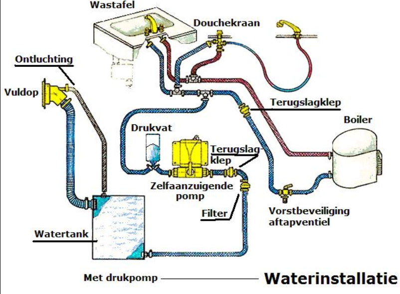 Het volgende schema toont ongeveer de opzet (geleend van deze pagina: https://www.zwiebelfam.nl/drinkwatervoorziening-2/):