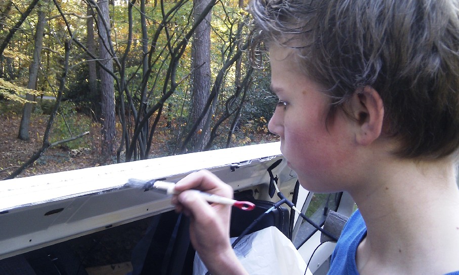 Vandaag weer tot laat bezig geweest, even een foutje, verkeerd plakband gebruikt om langs de kitranden netjes te werken. Het plankband ging er wel af maar de bruine kleur inclusief kleeflijm bleef op de t4. En nergens anders er mee af te halen dan met thinner of aceton. Dat is mooi balen!!! Maar het doek zit er nu in. morgen weer verder met de binnenkant.