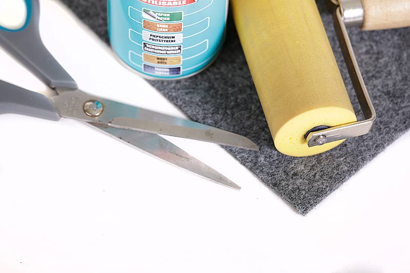 Bison Spray wordt aangebracht zowel op het vilt als op de 'mooie' kant van het board. Na een paar minuten wachten wordt het board op het vilt gelegd, omgedraaid en het vilt wordt met een roller goed aangedrukt. De plaat wordt weer teruggedraaid zodat de 'lelijke' kant van het board zichtbaar wordt. Een kleine strook lijm wordt op de buitense rand daarvan gespoten en het vilt wordt erop geplakt. Onder een stapel planken, dus goed aangeperst, krijgt het board met vilt de tijd om aan elkaar te hechten.