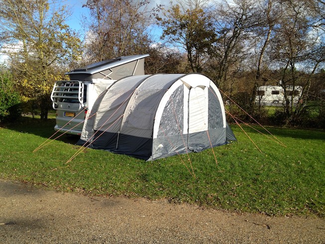 We hebben ook een bustent, maar die nemen we niet mee naar Winterberg, omdat de campingbaas heeft gezegd dat we de haringen toch niet de grond in krijgen om dat de plek 'gepflastert' is (betonvloer?).