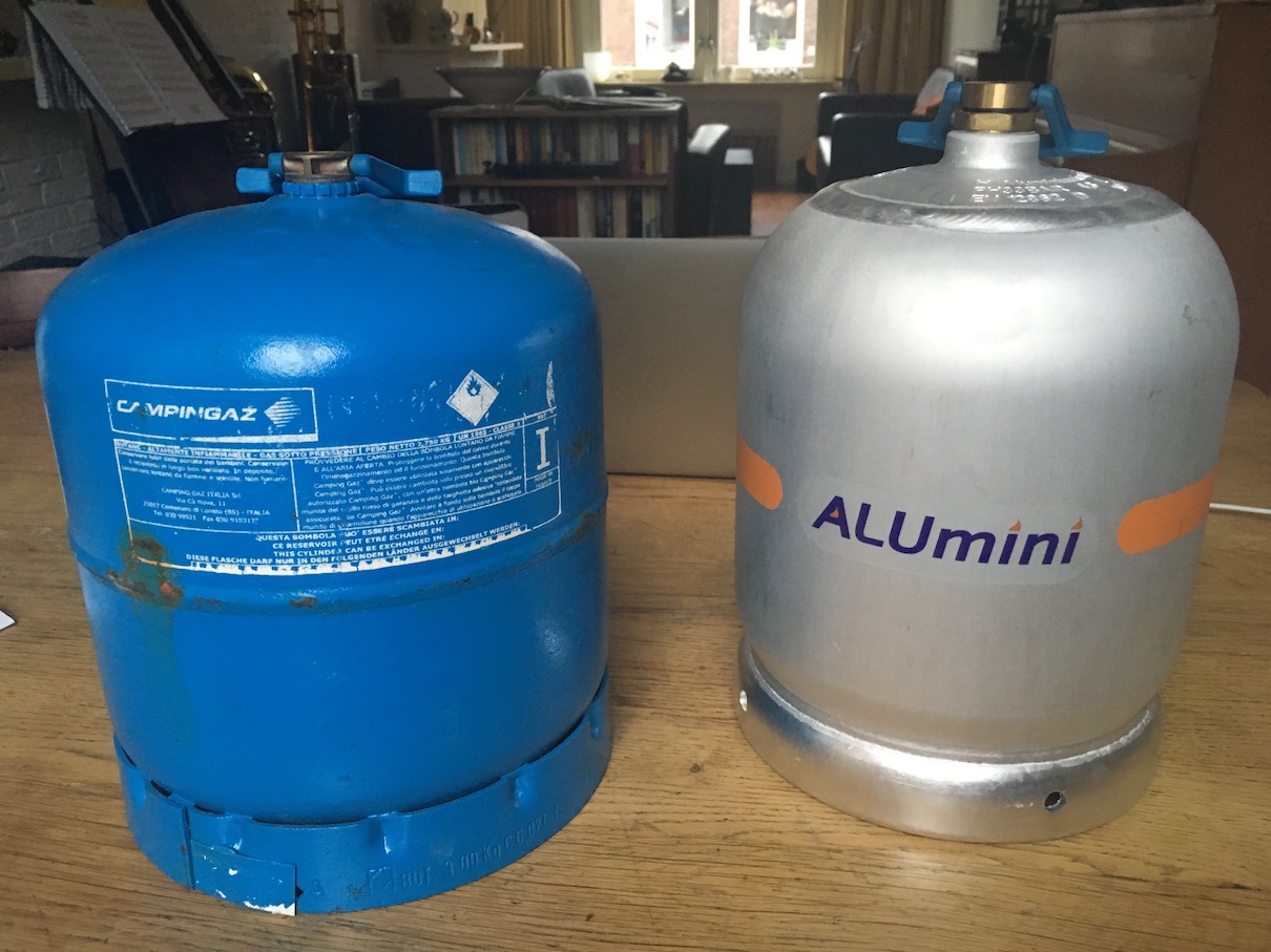 We hebben inmiddels een navulbare, kleine propaanfles gevonden als alternatief voor de Campingaz 907: De 2 liter ALUmini van Ekopool. On line besteld, na telefonisch overleg, bij een Duitse vakhandel, compleet met een setje vuladapters voor diverse Europese landen (o.a. Scandinavië: daar willen we ook nog eens heen in de winter, en daar is so wie so nergens Campingaz). Donderdag besteld, vandaag (maandag) aangekomen. Past perfect op de bestaande drukregelaar en in de gasbun: