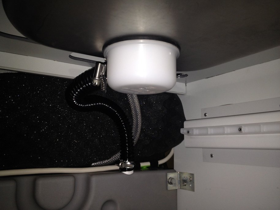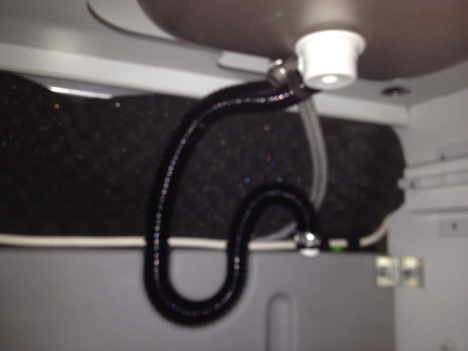 De gootsteenafvoer in de T5 California leidt vaak tot ergernis: het water loopt t e r g e n d l a n g z a a m weg. Op de diverse fora zijn al veel aanpassingen gesuggereerd. Sommigen korten de afvoerslang eenvoudig in, en halen de S-bocht eruit. Maar dan heb je geen stankafsluiter meer. Anderen maken een extra ontspanning net onder de siphon. Maar dat helpt maar een klein beetje.