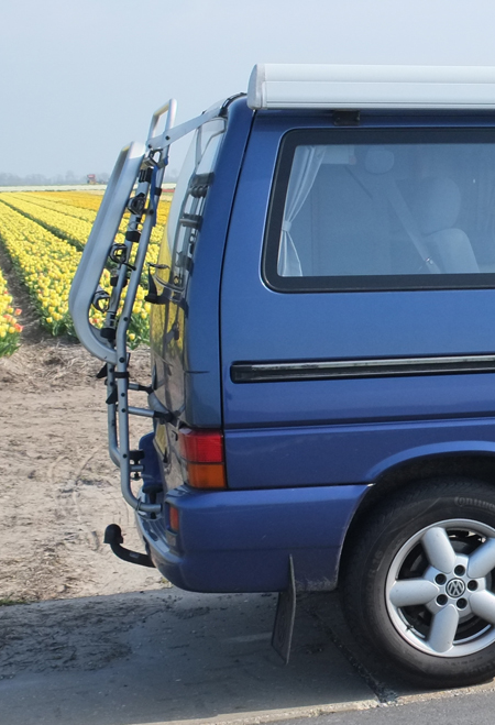 Een fietsendrager op een trekhaak is een oplossing maar lastig om iets te vinden dat kan blijven zitten als de klep open moet.