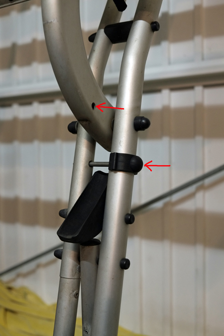 - In mijn rek zit een borgpen die het rek met de fietsgoten kan blokkeren als het naar beneden geklapt is. In het rek op ebay zie ik dit niet maar er zit ook geen gat om de borgpen in te steken, dus een iets andere (oudere?) variant? Zie ook de foto.