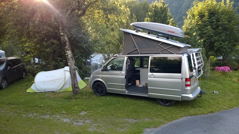 Hier ben ik het niet mee eens. Het hangt vooral af van je gezinsituatie en wensen. Wij hebben met zijn vieren fantastisch gekampeerd met onze aangepaste Multivan met 'gootsteen', kooktoestel, en compressor koelbox. Door het ontbreken van kastjes en een vaste keuken heb je veel meer flexibele ruimte en inderdaad 2 ruime tweepersoonsbedden van 160cm breed. Verkijk je niet op de beperkte ruimte in een T4 en T5. Alles mag er dan wel in zitten maar ook bij een california leef je vooral rond je camper. Een luifel en een bustent maken dit mogelijk. Twee schuifdeuren geven ook veel meer ruimte. Onderweg kan je met zijn 4-en in de auto slapen maar bij lekker zomers weer doe je dat niet. De kinderen slapen dan in een tentje en wij in het dak. Wel zijn we blij met ons electrische Californiadak op de Multivan. Met 4 personen heb je veel bagage, zeker wij ;-) : los van de normale uitrusting een gitaar, 2 longboards, 4 fietsen, een barbecue, complete sportuitrustingen, etc, etc. Wij hebben dan ook een grote dakkoffer op het hefdak en die kan er gewoon op blijven zitten met allerlei spullen erin. Afgezien van de vraag of op bv een Reimodak ook dakkoffer bevestigingspunten zitten is het maar de vraag of de gasveren dat gewicht houden. Ik vermoed van niet. De originele VW T5 fietsendrager is ook een uitkomst: we kunnen zo 4 fietsen meenemen. De Huishoudaccu van de multivan is groot zat: we hebben maar 1 dag stroom van de camping gebruikt.Pascal-141 schreef: Een "multivan" met een zelfgemaakt kastje erin en een dakje erop is misschien een "camper" voor de belastingsdienst , maar eigenlijk is het maar een "weekend auto" . Voordeel van een Multivan is het brede bed / achterbank . Nadeel is dat er geen vaste kasten zijn , geen gootsteen , geen vuurtjes , geen vaste koelkast , geen grote woonbatterij (wel een kleine 2e batterij) .