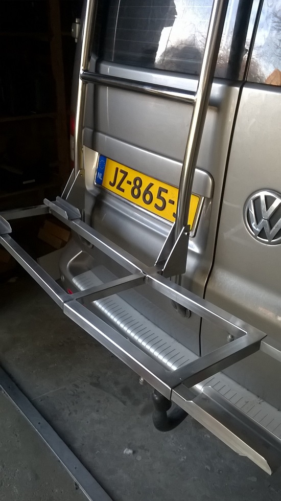 Daarom een fietsendrager gemaakt geheel van RVS, en opgehangen aan de linkerachterdeur De verticale stangen aan de bovenkant in rubber "opgehangen" en aan de onderzijde van binnenuit vastgeschroefd. De drager zelf, neem je er nu met twee boutjes simpelweg af, of je klapt hem op naar boven. De verticale gepolijste stangen laat ik permanent zitten. Ziet er nog leuk uit ook .