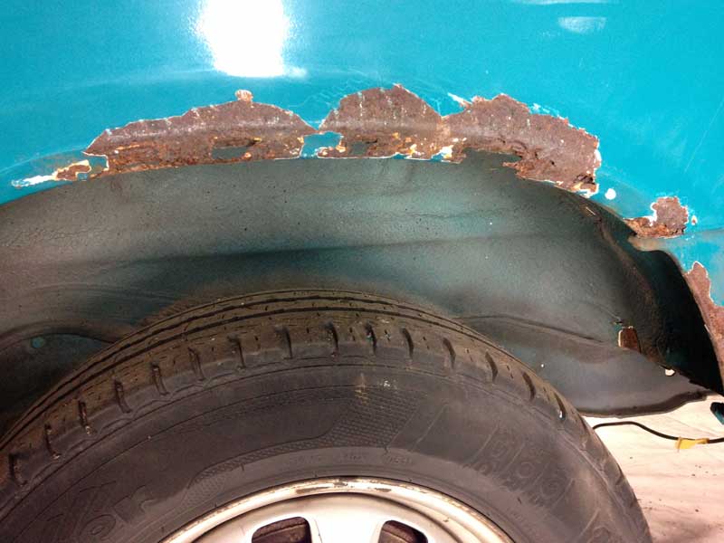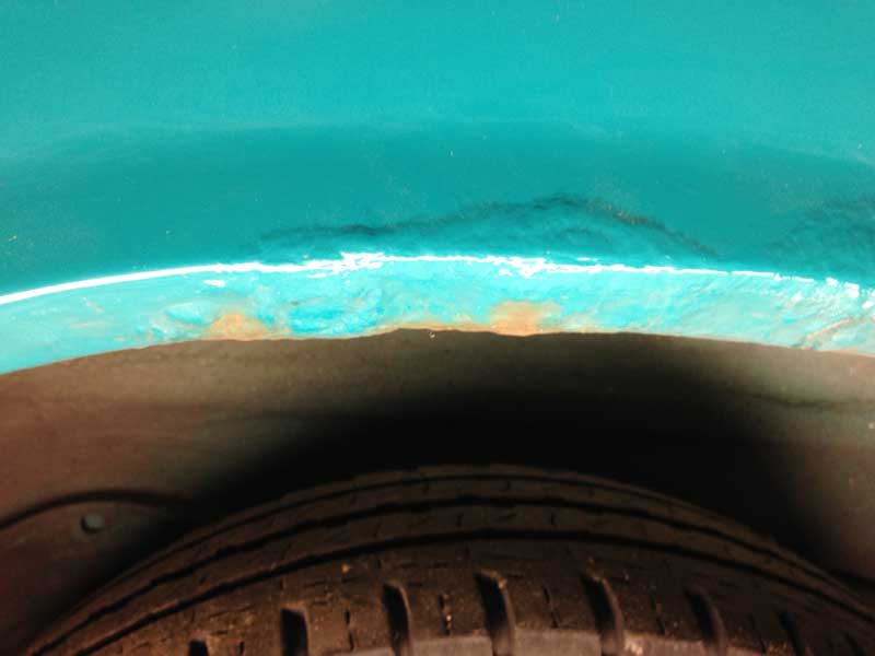 Nu -2016-2017- begonnen langs diezelfde wielranden weer aardige blazen te ontstaan: En als je met een schroevendraaier gaat schrapen wordt duidelijk dat het niet om slecht hechtende verf alleen gaat