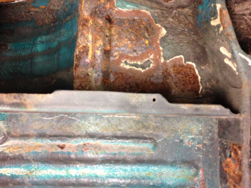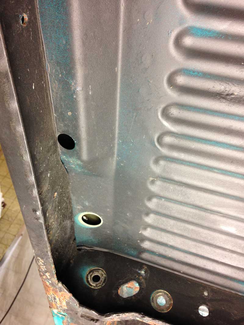 Een kale onderzijde ter hoogte van de achterwielen: En de beruchte (ddorgezaagde) C-stijl van binnen.