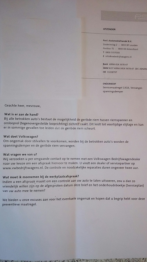Die van mij is ook terug geweest van de week, betreft een Transporter gp uit 2015. Riemspanner en riem vervangen...