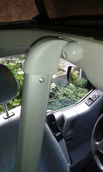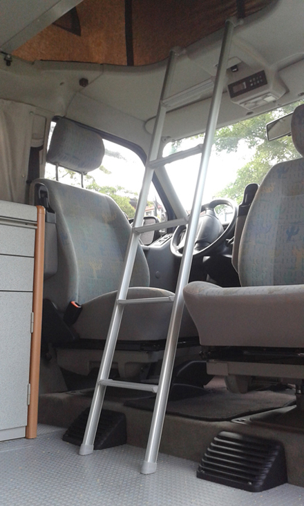 Ik ben inmiddels 72 en dus niet meer zo heel soepel en gaan we de uitdaging niet aan! We slapen heel lekker beneden. Maar er gaan wel af en toe 1 of 2 kleinkinderen mee die zonder hulpmiddelen en pijlsnel boven kunnen komen. Maar bij dat omhoog gaan maken ze wel ongewilde woeste schopbewegingen die mij voor het heel blijven van het interieur doen vrezen. Daarom heb ik een mini-touwladdertje met 3 treden gemaakt wat aan de hoofdsteunen hangt. Wanneer het niet in gebruik is ligt het als klein pakketje in een verloren hoekje.