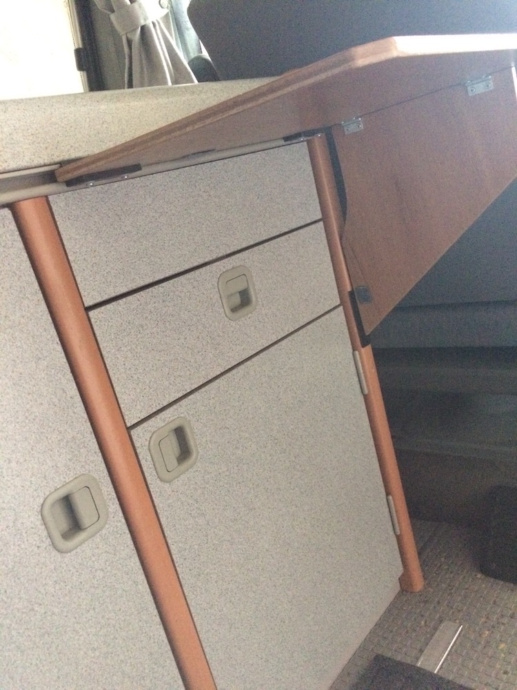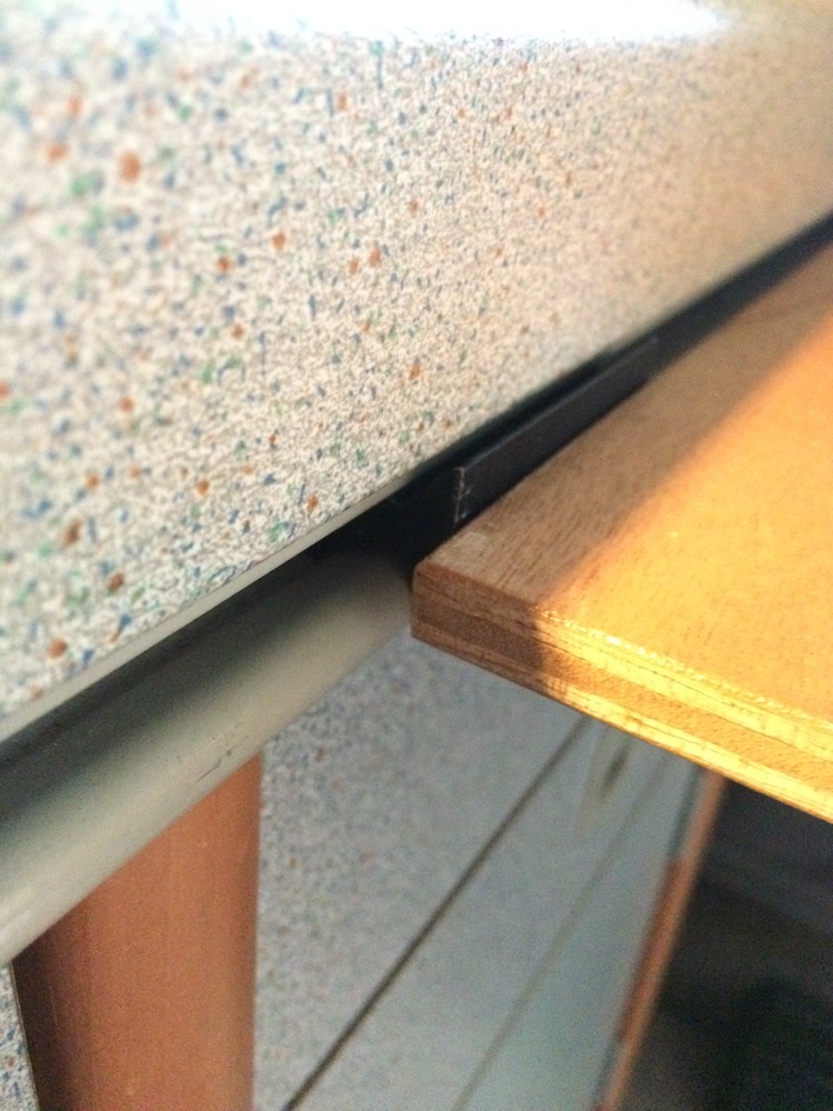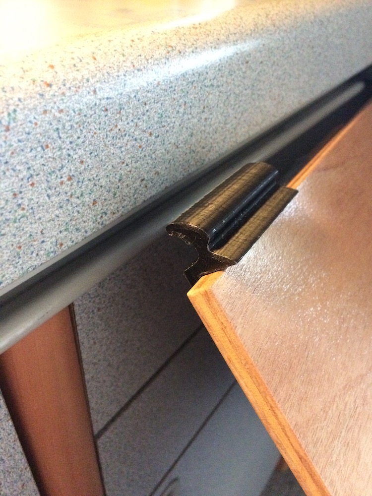 Een collega van mij heeft een 3D printer en daar kan je leuke dingen mee printen, zoals een beugeltje (zoals het origineel) welke in het keukenprofiel past en waar je dan vervolgens een plankje aan maakt welke als tafeltje dienst doet.