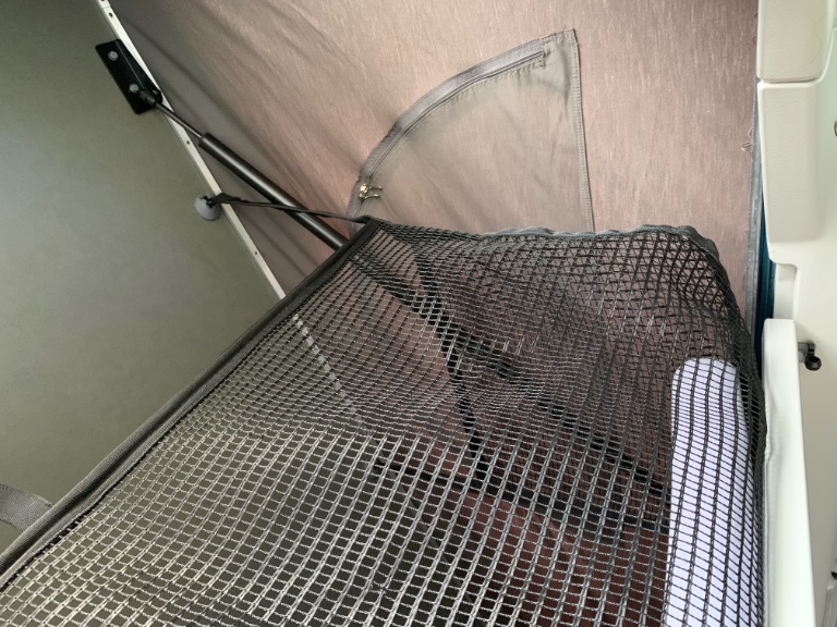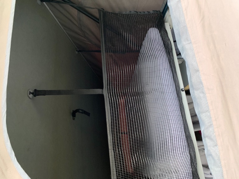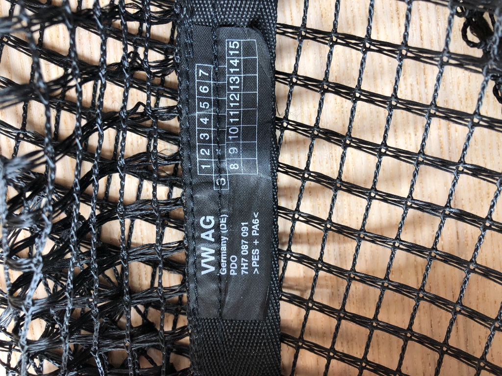 Nou nee, ik weet niet hoe ‘mooi’ en sluitend het zou moeten passen, maar ik denk dat er iets niet klopt. Het is wel een officieel valnet, zo lijkt het etiket, maar blijkbaar voor een ander type hefdak (VW AG, staat er op?). De breedte en lengte lijken te kloppen. Maar ik heb op mijn bedplank 3 drukknopen (links, midden, rechts), het valnet maar 2. Ik heb tegen het dak 5 ophangpunten, het valnet maar 4. En dan dus de verkeerde. En de 4 ‘touwen’ zijn ook langer (voor een hoger dak?). De vierkante uitsparing voor het ophangpunt van de bedplank (voor als je het bed naar boven klapt) is dan weer wel passend.