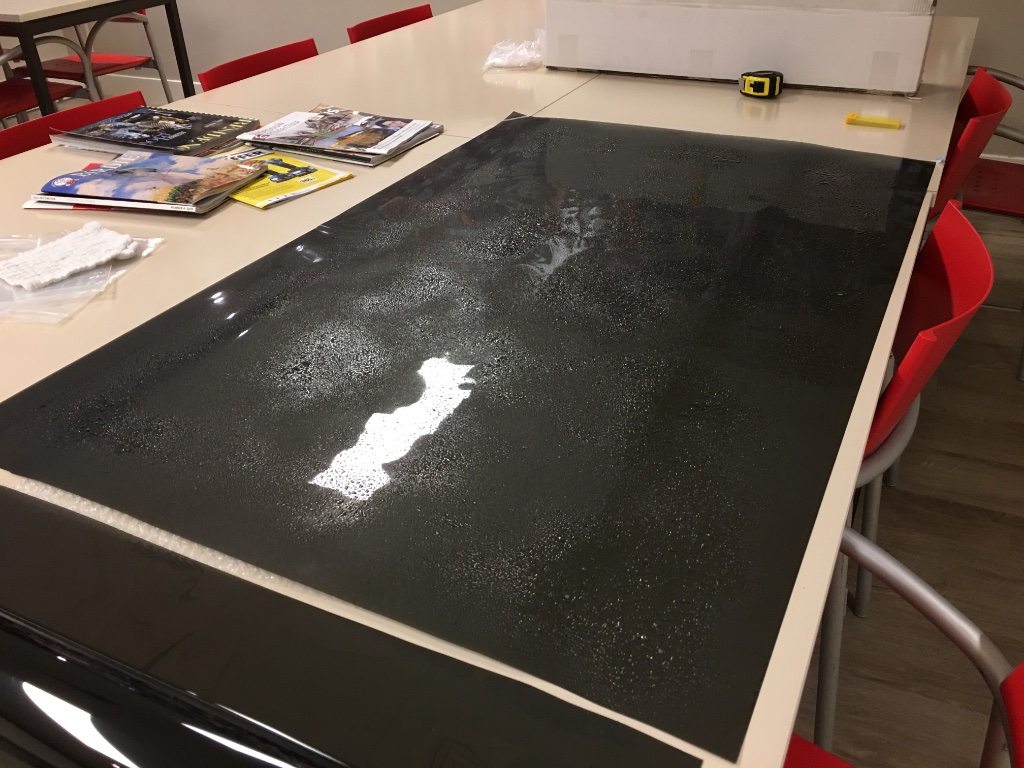 Eerste ruit, eerste poging. Folie afgemeten, afgesneden en vooraf ingespayed met zeepwater