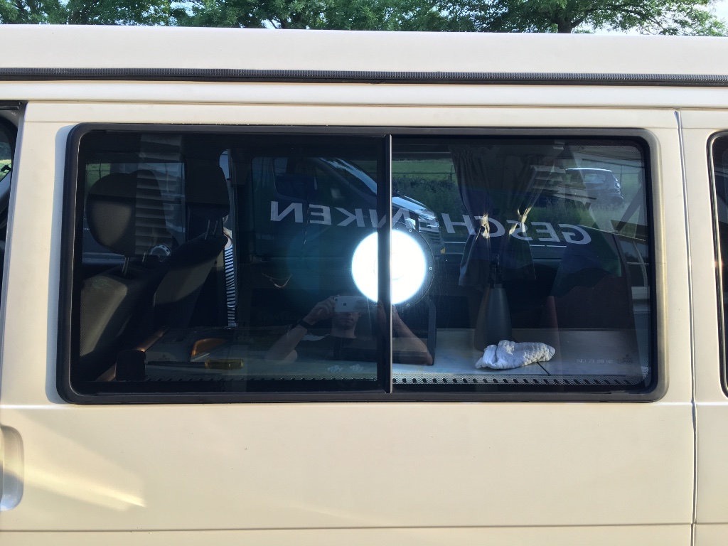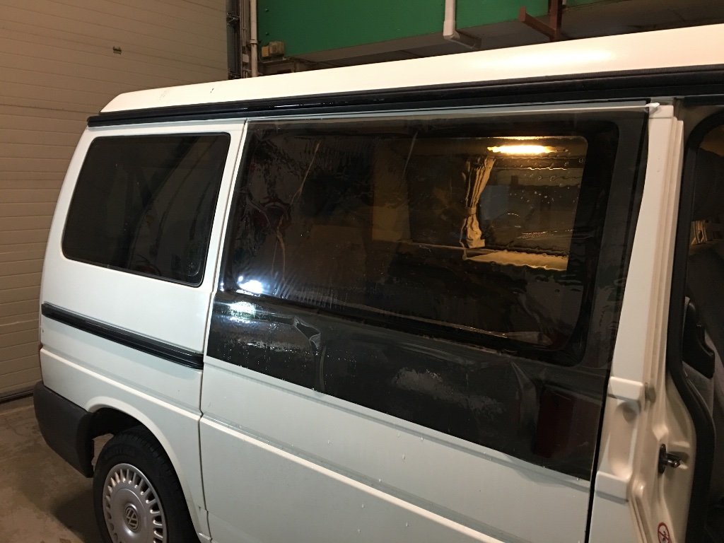 Voor de voorruiten heb ik 70% doorlaat gebruikt, met name met het doel om een brandende zomer zon wat buiten te houden. (geen airco) Het staat wel mooier dan dat blanke glas van de T4 en is niet zo donker dat je gedoe krijgt.