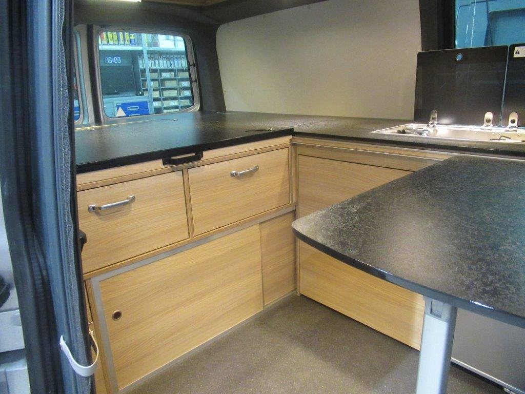 een steun rust die aan de deurstijl bevestigd is en aan de koelkast kant steun de plaat op de rail van de tafel (deze is verstevigd). Dus wij slapen op de keuken in een riant bed. Paar matjes van 75x200x10 maakt het zeer comfortabel. OP de tweede foto van onderen zie je de plaat met zwarte handgreep liggen.