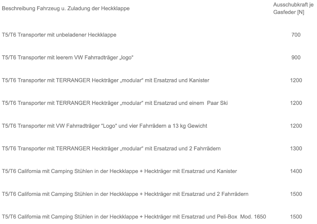 Hai John heb op onze Transporter zwaardere gasveren laten monteren Triscan 1080 N art.nr: 871029295. Op de hoge fietsdrager met 1 sportfiets en 1 mountainbike blijft de achterklep net aan open staan. Heb trouwens een set orginele 0970 N art.nr: 7HO 827550 over die voor een zacht prijsje weg mogen.