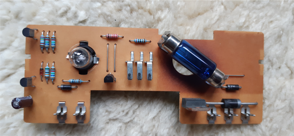 Dit ding is volgens mij een transistor, dat is een soort elektronische schakelaar. Het zou goed kunnen dat deze wordt gebruikt om het licht te dimmen door steeds een beetje minder stroom door te laten.