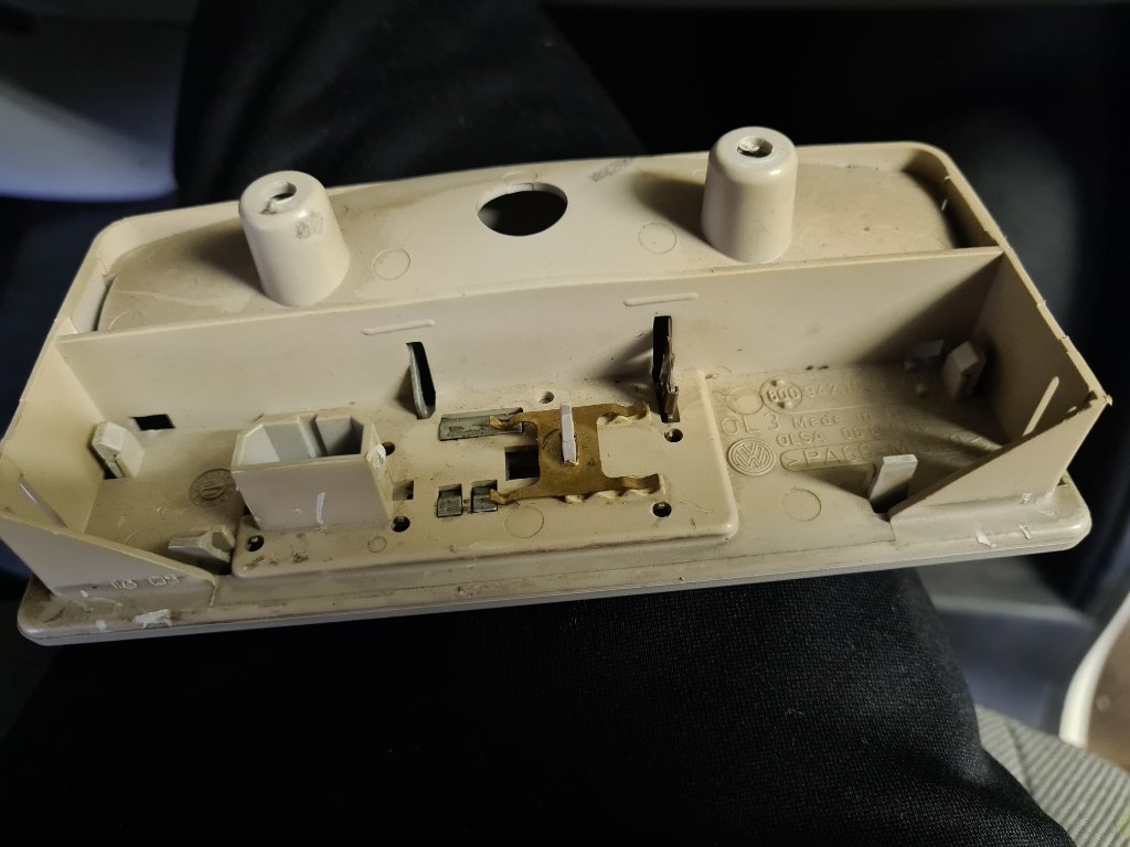 Ik wil de (standaard) cabine verlichting weer herinstalleren, maar het aan/uit knopje hangt flink los. Wat zie ik over het hoofd? Lijkt wel of ik een onderdeel mis.