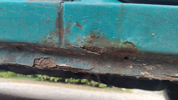- De wielkaste links en rechts voorin, achterin de kasten lijkt het redelijk te zijn. Naast de wielkast zitten in de groene lak kleine bobbels waar vermoedelijk roest onder zit.