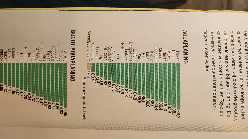 Hoeveel noodstops in die 100.000 km?krekwakwol schreef: 10 jul 2022, 21:56 Op onze laatste "normale" auto, een Subaru Forester heb ik 100.000km lang op één set Nokian winterbanden gereden, zomer en winter, zonder brokken en zonder problemen, halverwege eens voor en achterbanden gewisseld.