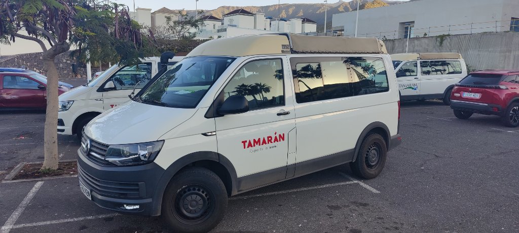 Tamaran ( zie het logo op de deur) verzorgt jeepsafari's op Tenerife.