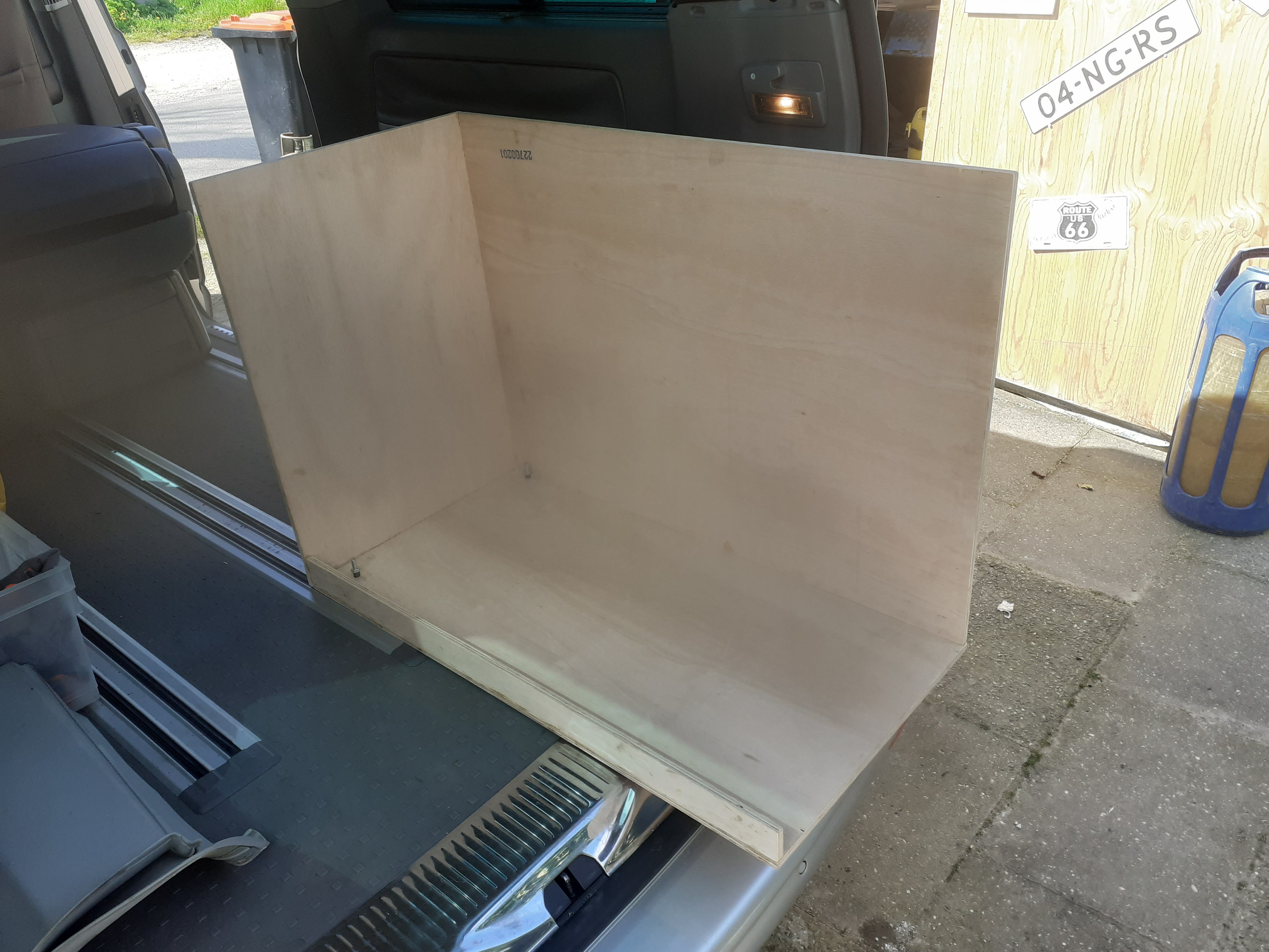 Dus dan maar een begin aan het keukentje maken Mijn idee is het keukenblokje naar buiten te kunnen rijden zo dat je achter de bus kan koken en met het idee op de toekomst er een tent om de achterklep bij te kopen
