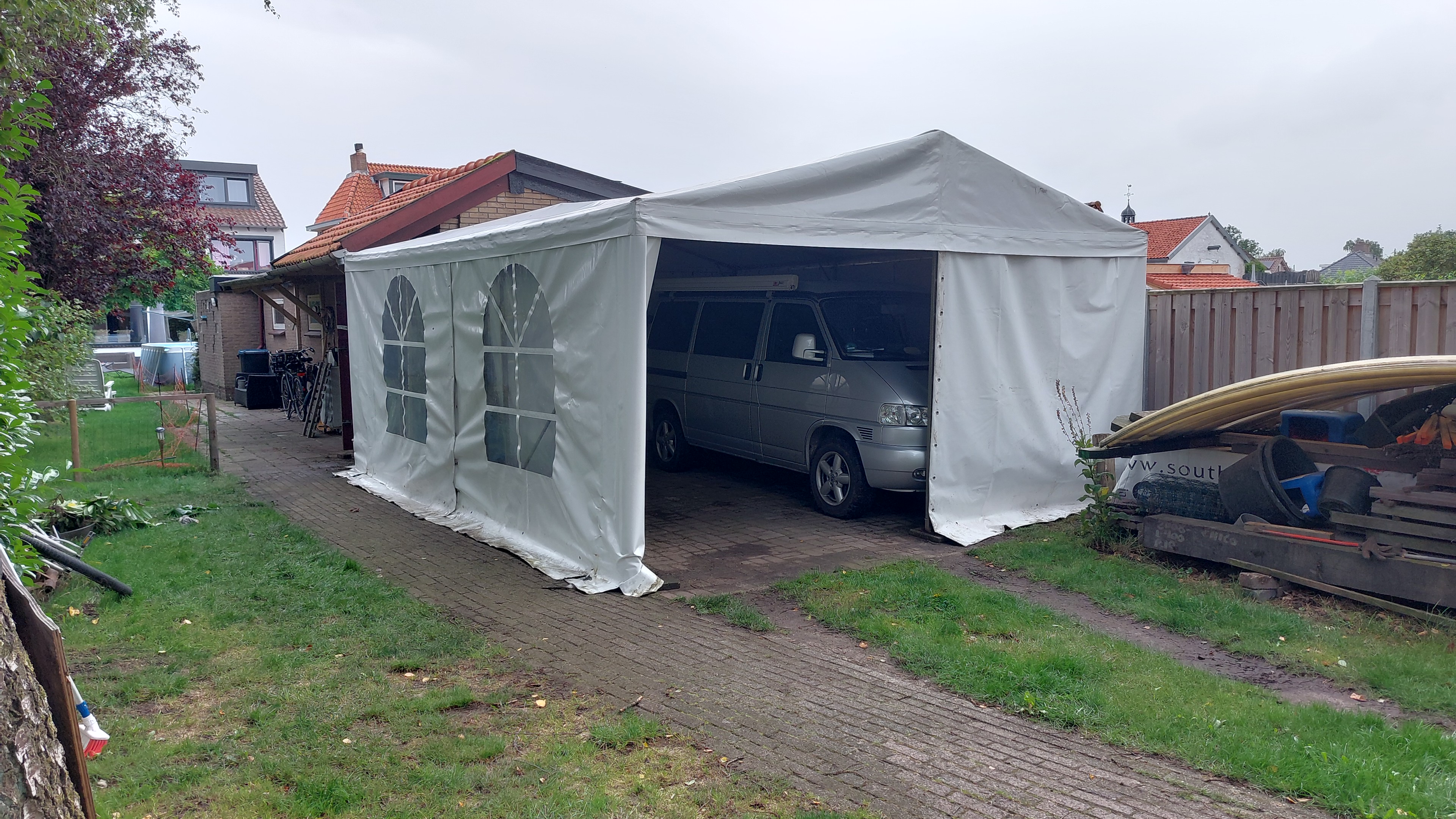 Met het fijne zomer tegenwoordig besloten om een tent te kopen waar de bus in kan. Garage is aan de krappe kant en wat meer ruimte er om heen werkt ook fijner.