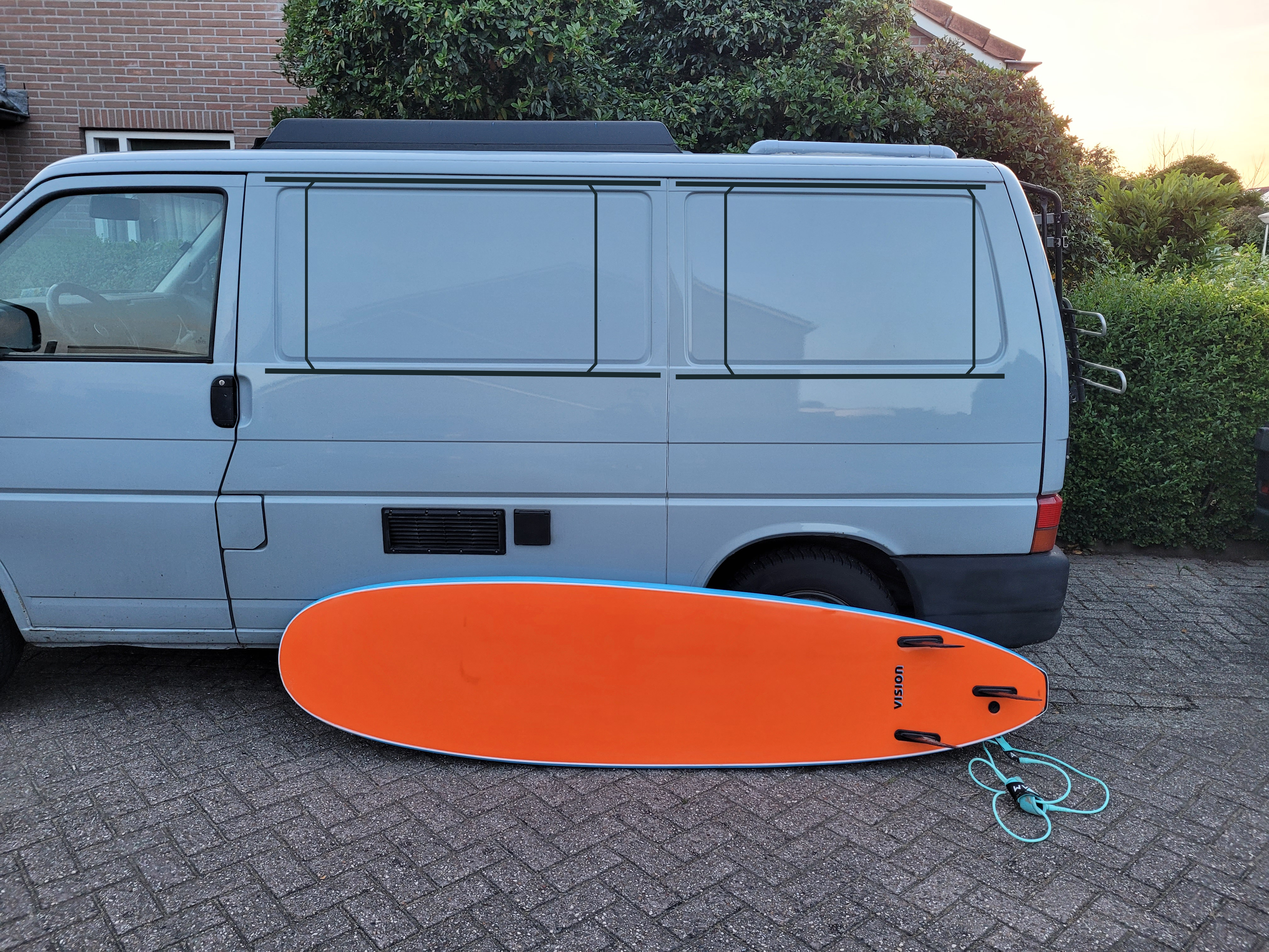 Ik was al een tijd op zoek naar een manier om mijn surfplanken aan de zijkant van de bus te bevestigen. Door het hefdakje, de peeslijn aan de schuifdeurkant en het zonnepaneel kan ik geen dakdragers meer plaatsen. Iets waar ik destijds niet helemaal over na heb gedacht. Hier een voorbeeld van de bus en een surfplank en een schetsje van hoe het zou moeten worden. Meerdere foto's volgen nog.