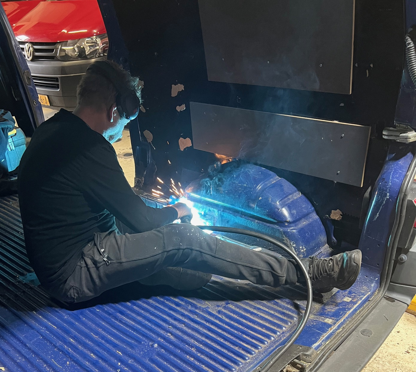 Zaterdag eindelijk droog kunnen staan en de wielbakken achterin dicht gelast. Leuk dat VW ooit bedacht heeft daar een gat in te maken om de gordel bout in te zetten. Wat na jaren er voor zorgt dat de wielkasten doorroesten. Maar dat is ook weer opgelo(a)st