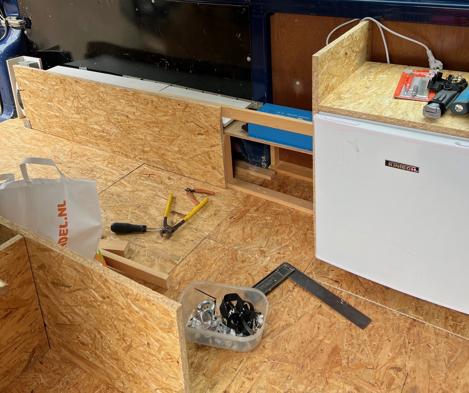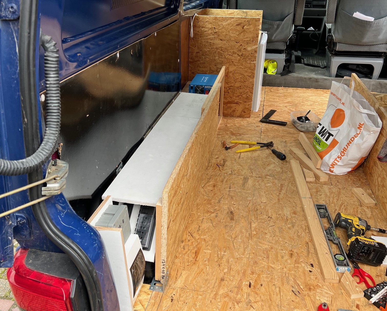 Schot geplaatst tegen de wielbak en accu erachter, aardlek/zekeringkast achter het achterlicht en begonnen aan de keuken.