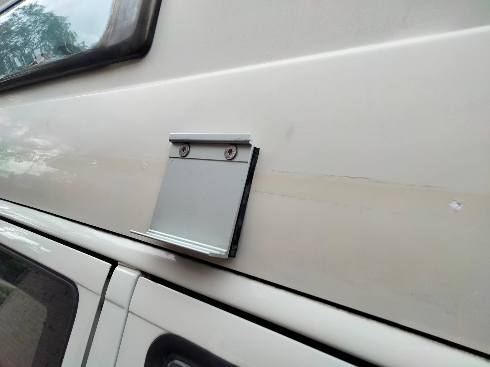 Wel met speciaal voor Westfalia hoogdak ontwikkelde adapters van Fiamma want met luifel meegeleverde beugels zijn in dit geval niet bruikbaar vanwege horizontale ronding in dak en omdat er in dit geval geen slotbouten gebruikt worden.