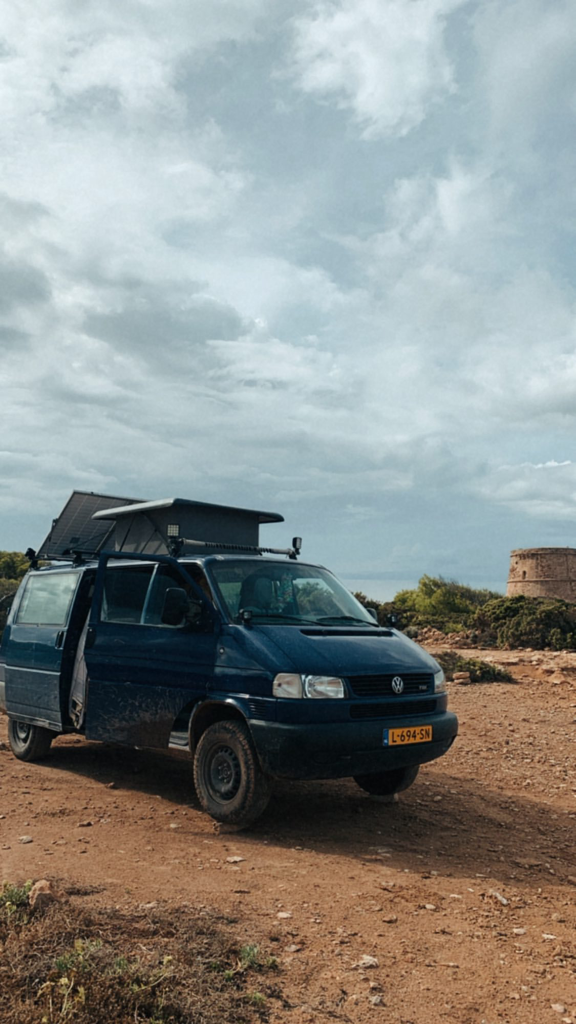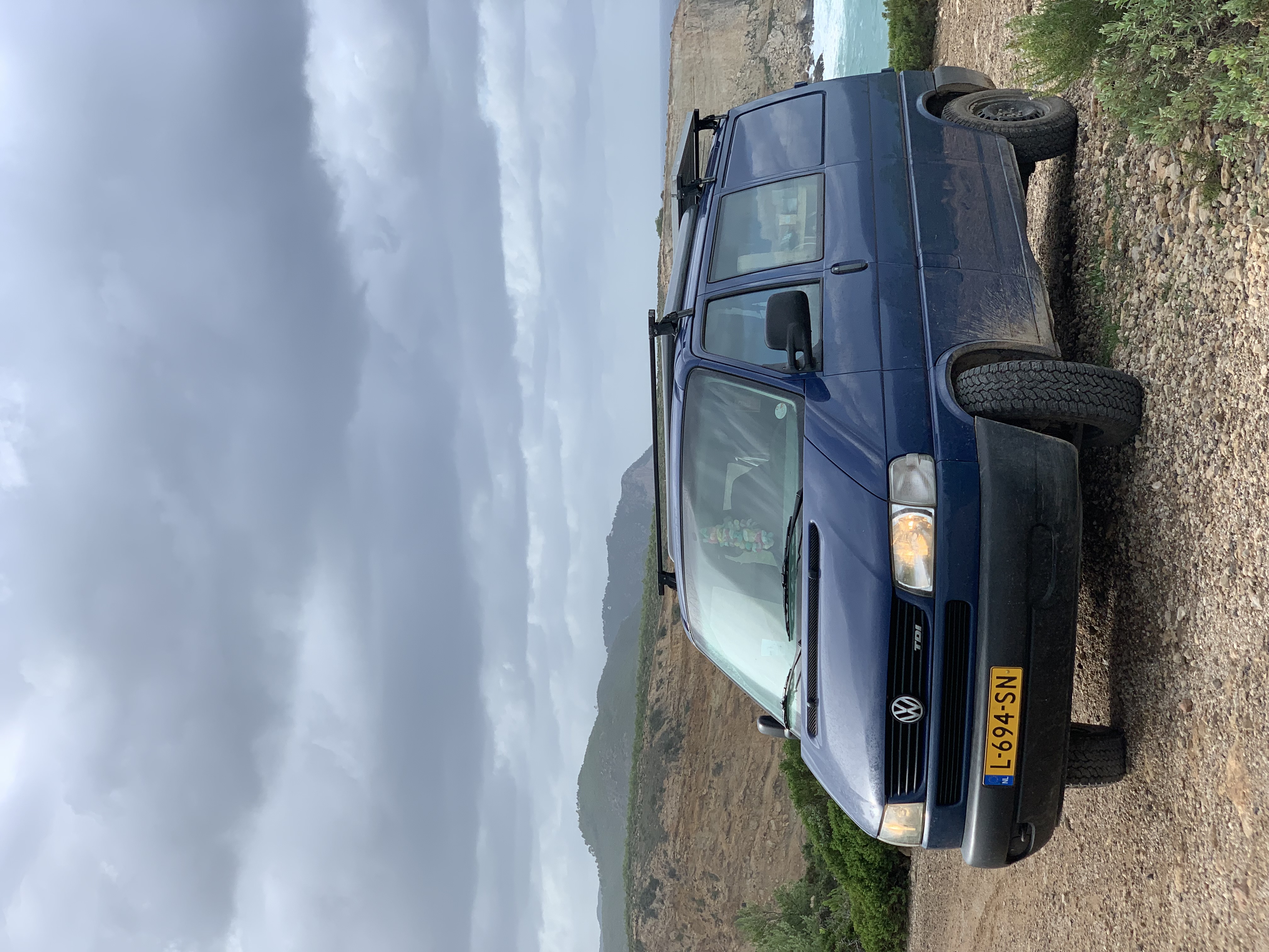 Toen naar het buitenland vertrokken om te werken, busje is nu kwam de behoefte aan meer hoogte want de bus had wat weg van een buikschuiver. Dus ambulance veren gekocht van het forum en de voorkant omhoog gedraaid. Dat in combinatie met grotere wielen kwam de bus mooi hoog op z’n pootjes te staan. Geen gezeur met stenen of dat de wielen de wielkas raken bij inveren.
