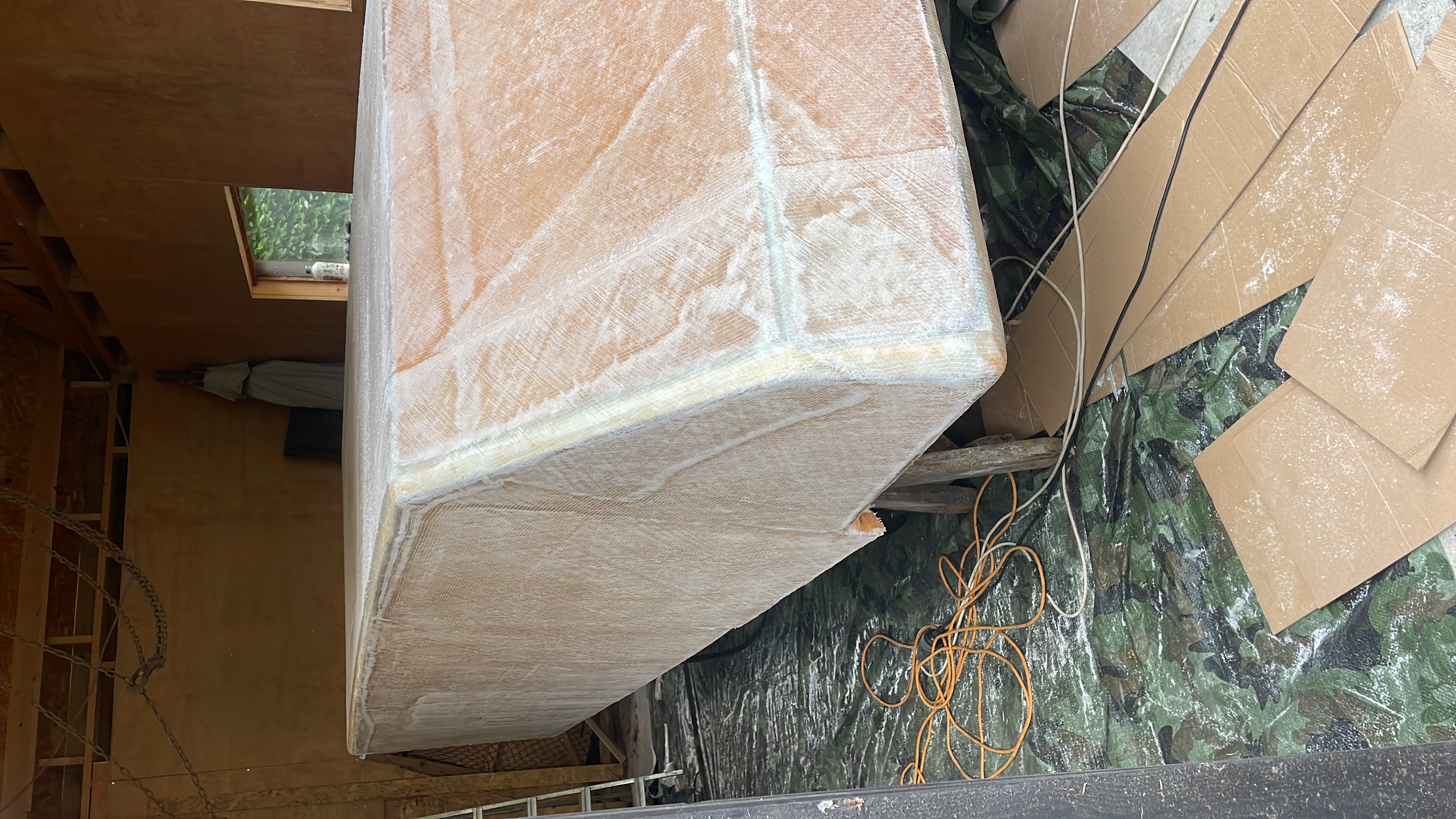 Eerst veel te weinig epoxy gekocht dus maar 1 kant kunnen doen. Toen ook maar meer glasweefsel gekocht en dat bleek geen verkeerde zet te zijn. Uiteindelijk ruim 15 kg epoxy gebruikt en 30 m2 glasweefsel. Heel veel werk en vooral heel smerig werk, zeker om de mat tegen de onderkant van de kuif te krijgen.