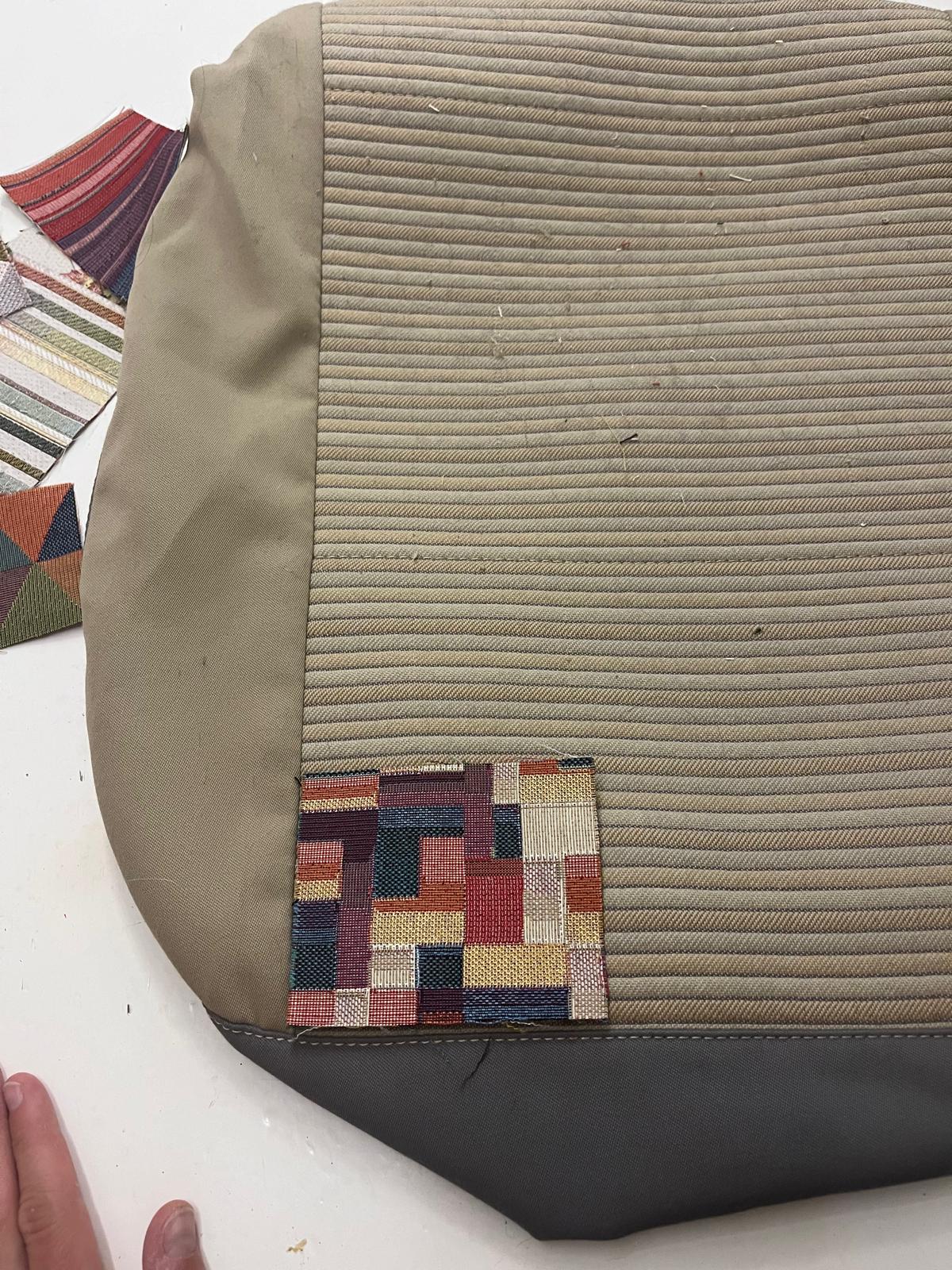 Voordeel van de hoezen 'hergebruiken' is dat je een goed mooi patroon hebt en ook dat de grijze zijkanten van de bekleding hergebruikt worden, en hier zaten juist ook alle tierelantijntjes qua bevestigingen en klittenband, koordjes etc in. Dit is allemaal hetzelfde gebleven waardoor de pasvorm identiek is aan het origineel.