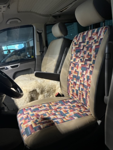 Onze bus kwam met de 'Indian Summer' bekleding, oftewel, in onze ogen, de saaie beige variant, en een hele set van Brandrup Second Skins in dezelfde saaie stof.