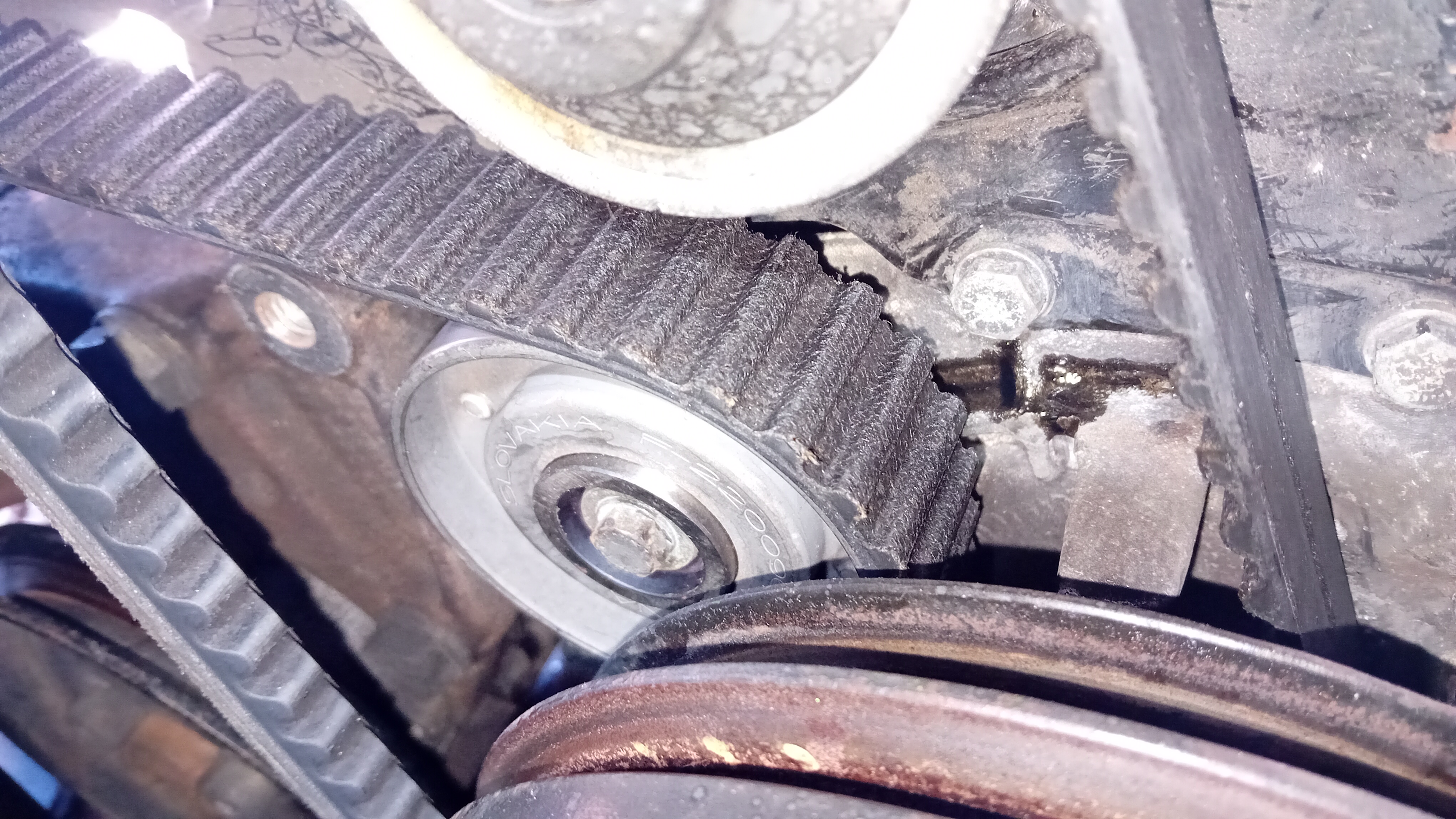De nieuwe distributieriem staat vettig en loopt ook niet 100% op het tandwiel ongeveer 1mm van de rand. Dat was voorheen ook al het geval, maar lijkt me niet de bedoeling.