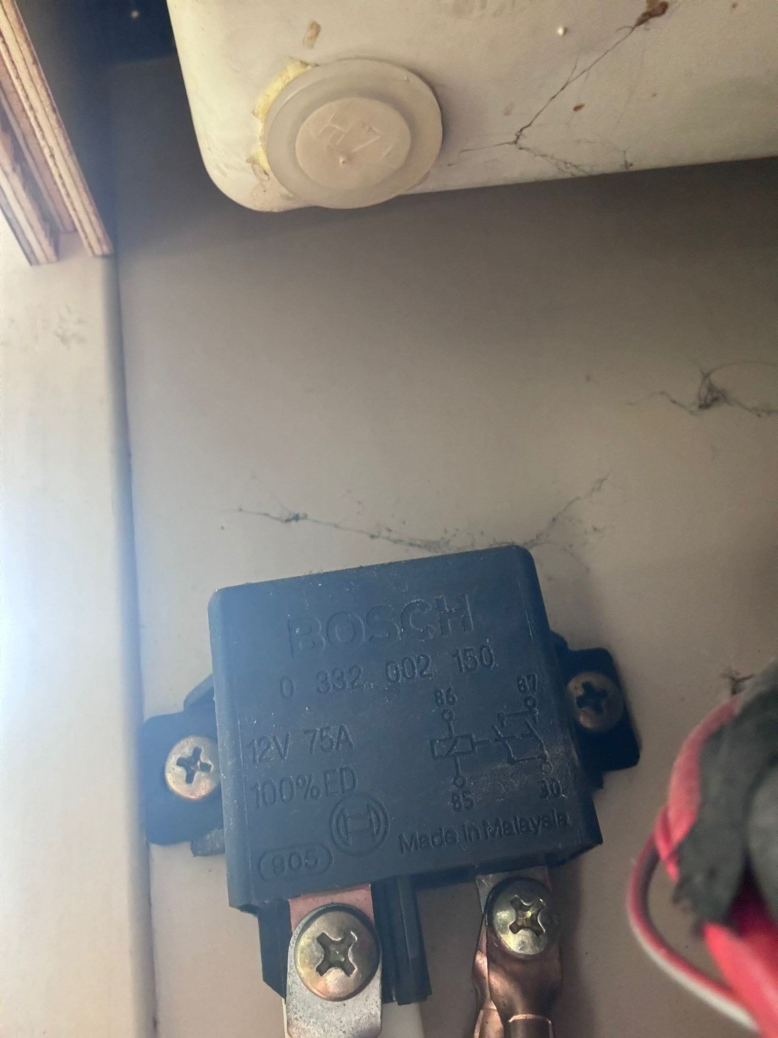 1) als contact sleutel eruit is en de start-accu wordt aangesloten (bij huishoud-accu is plus-pool losgekoppeld) komt er spanning op de witte stuurstekker van het relais (zie foto) en trekt het relais aan, waardoor huishoudapparaten de start-accu leegtrekken.