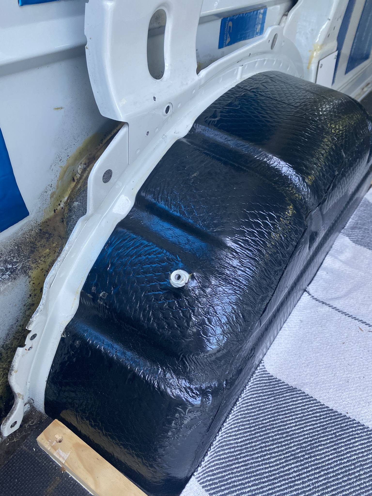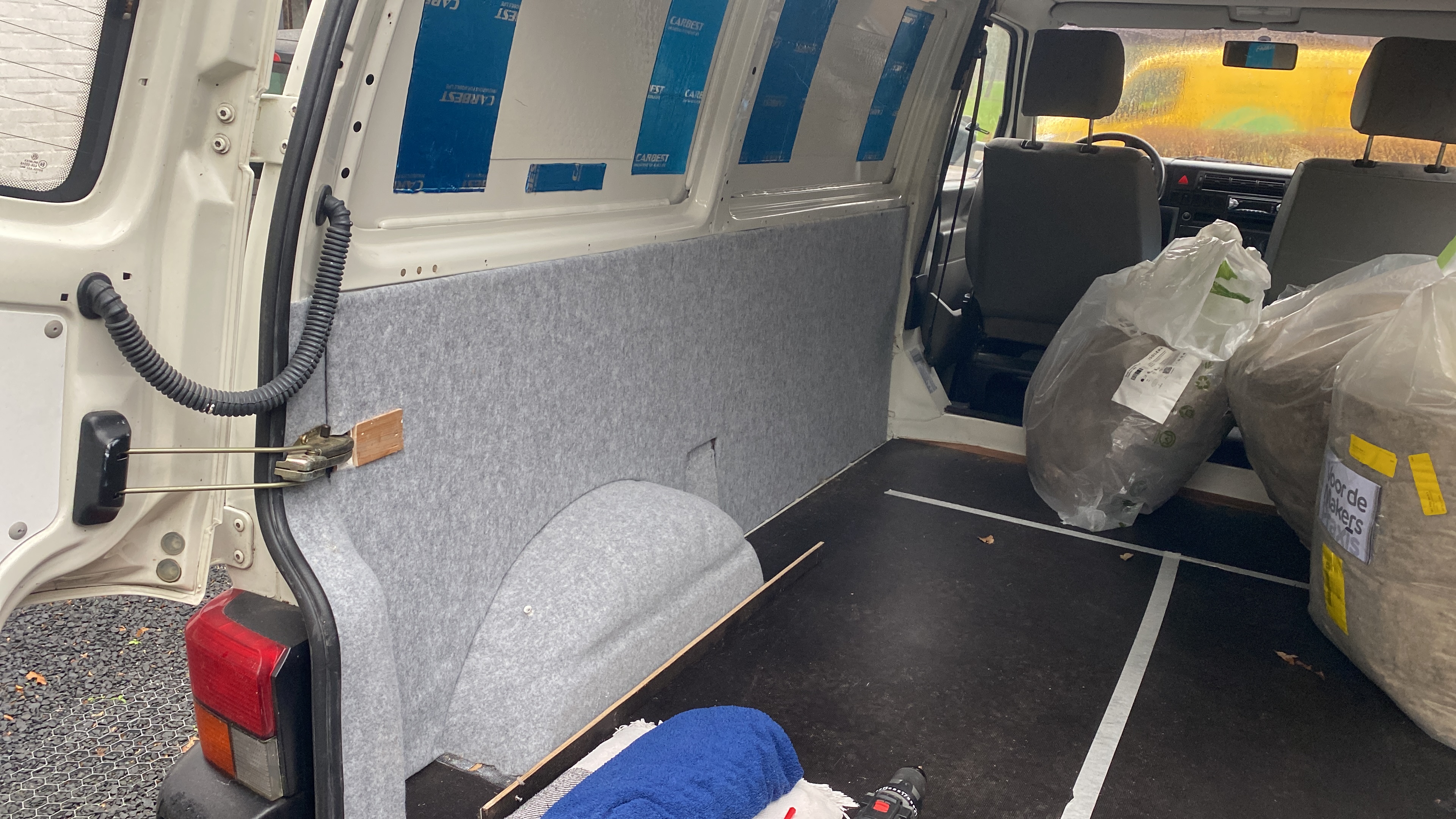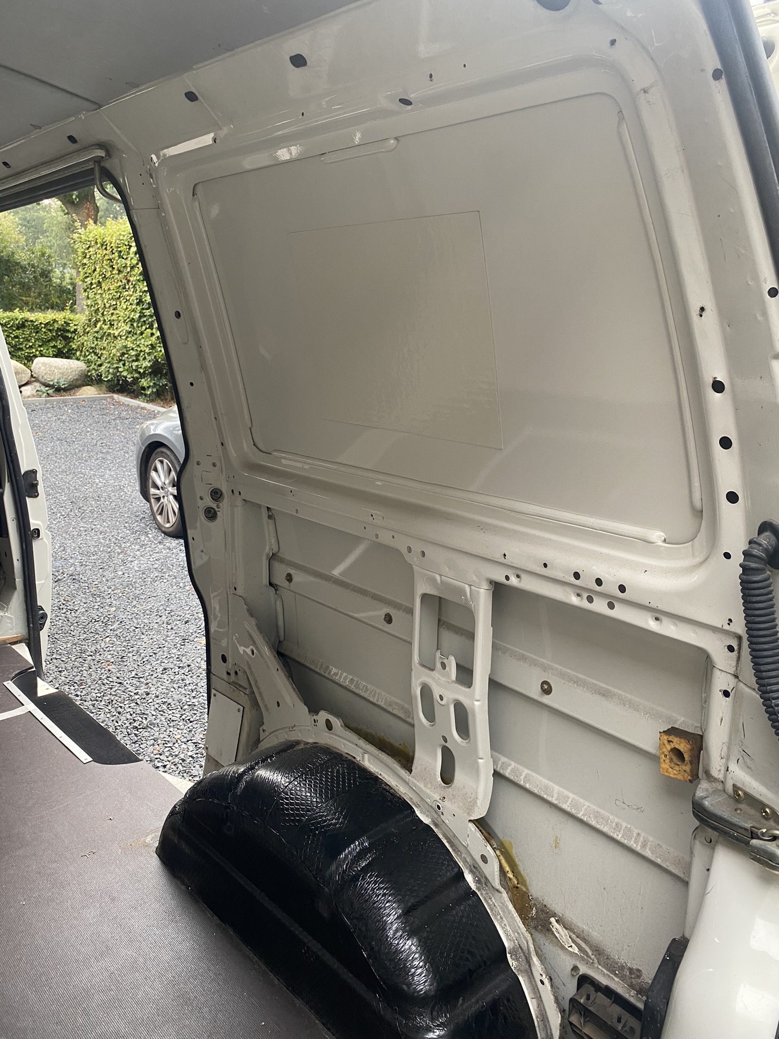 Nu ben ik bezig om de achterdeuren af te werken met vilt, wat opvalt is dat de rechterklep van buiten wel te openen is maar van binnenuit niet opengaat.