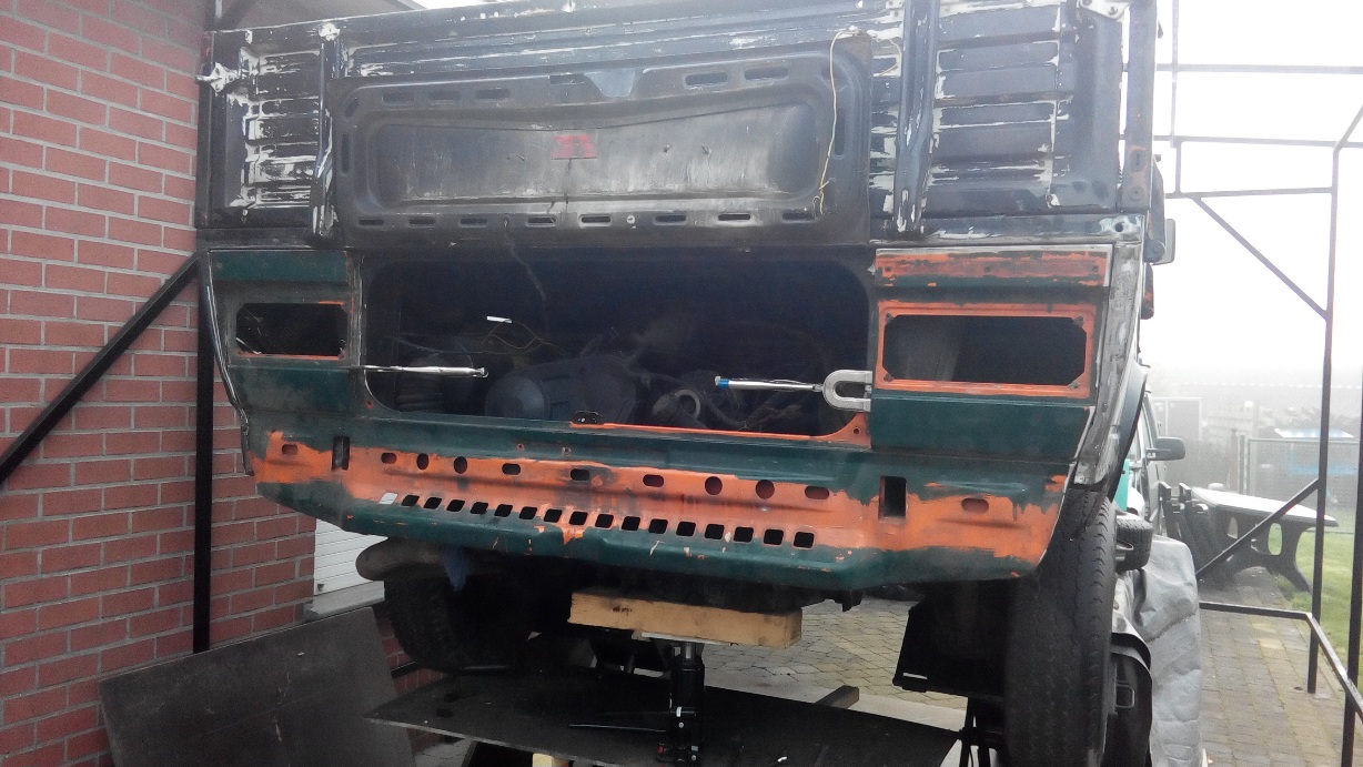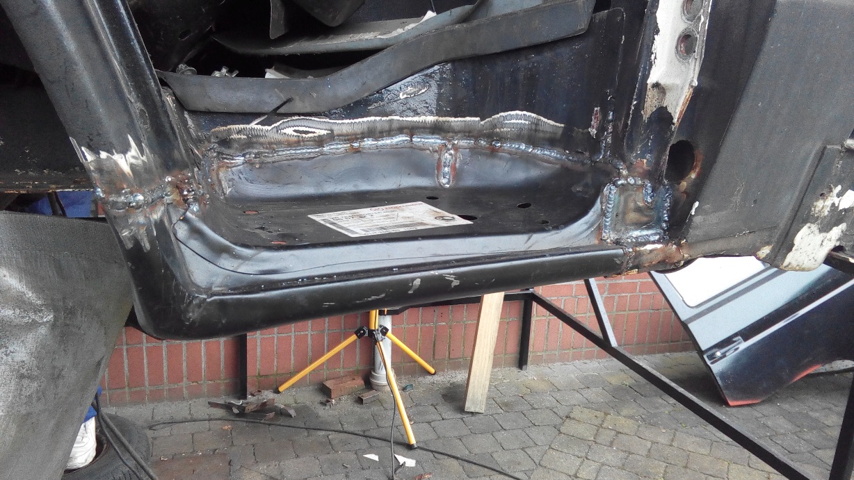 Alles laten stralen wat nog te redden was , en de rest vervangen door onderdelen uit een donor. Dan alles in de 2k epoxy primer , en dan meteen laten lakken.