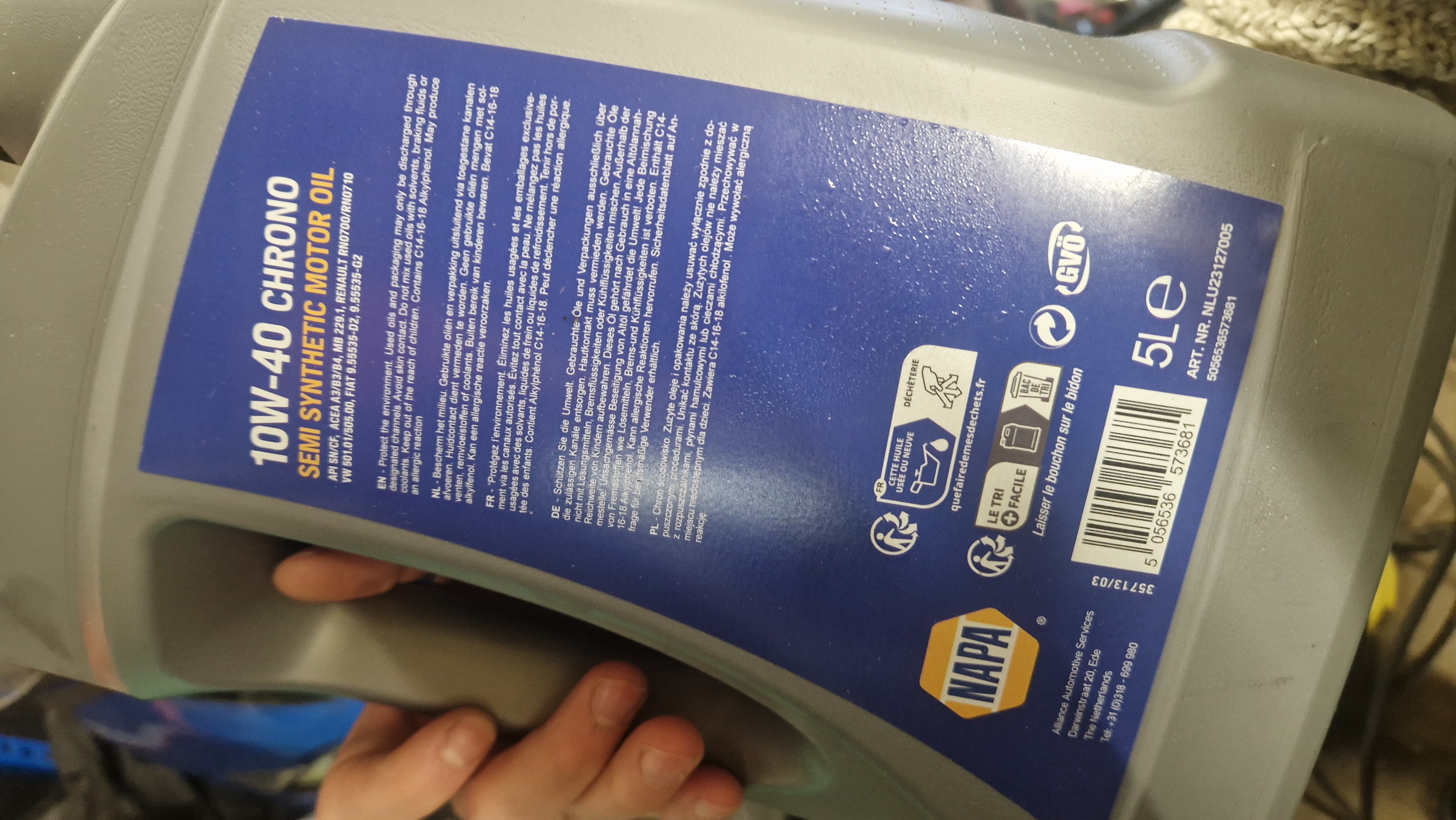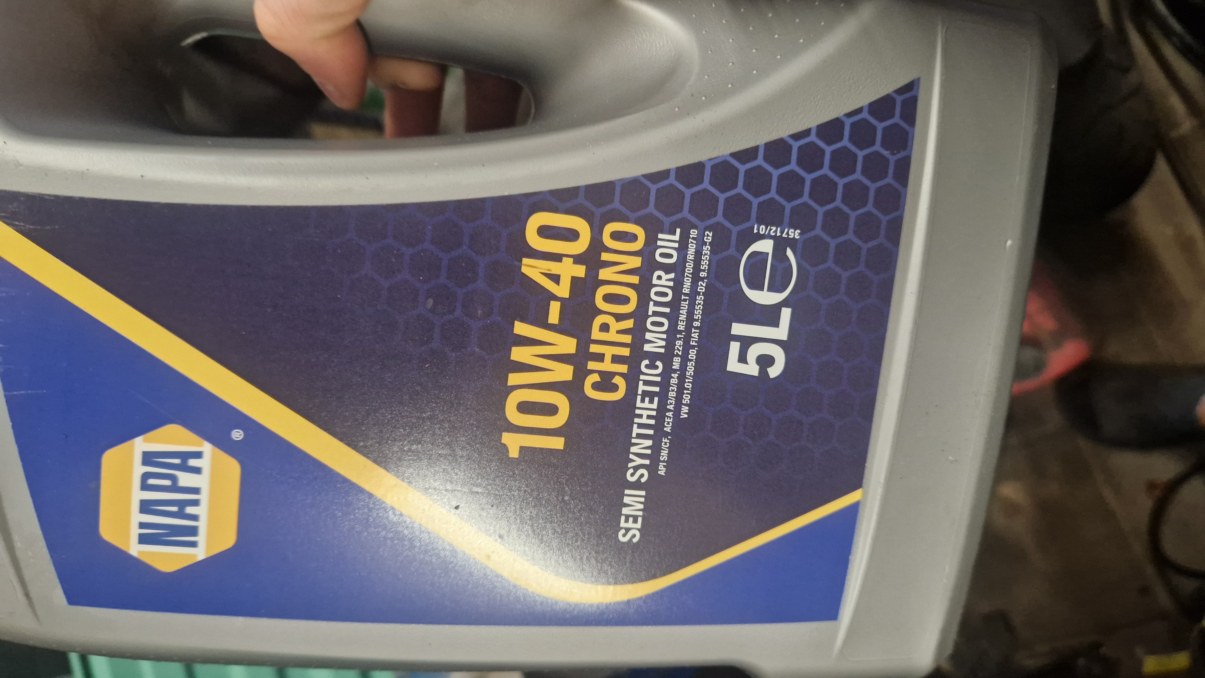 10w40 chrono semi synthetische olie (ik kreeg de fles mee zodat ik eventueel laatste deel kon bijvoegen als de oliepeil zou zakken). Ik ben niet geheel bekend met welke olie goed / slecht is. Ik heb foto's bijgevoegd wellicht dat u hier de viscositeit uit kan halen.