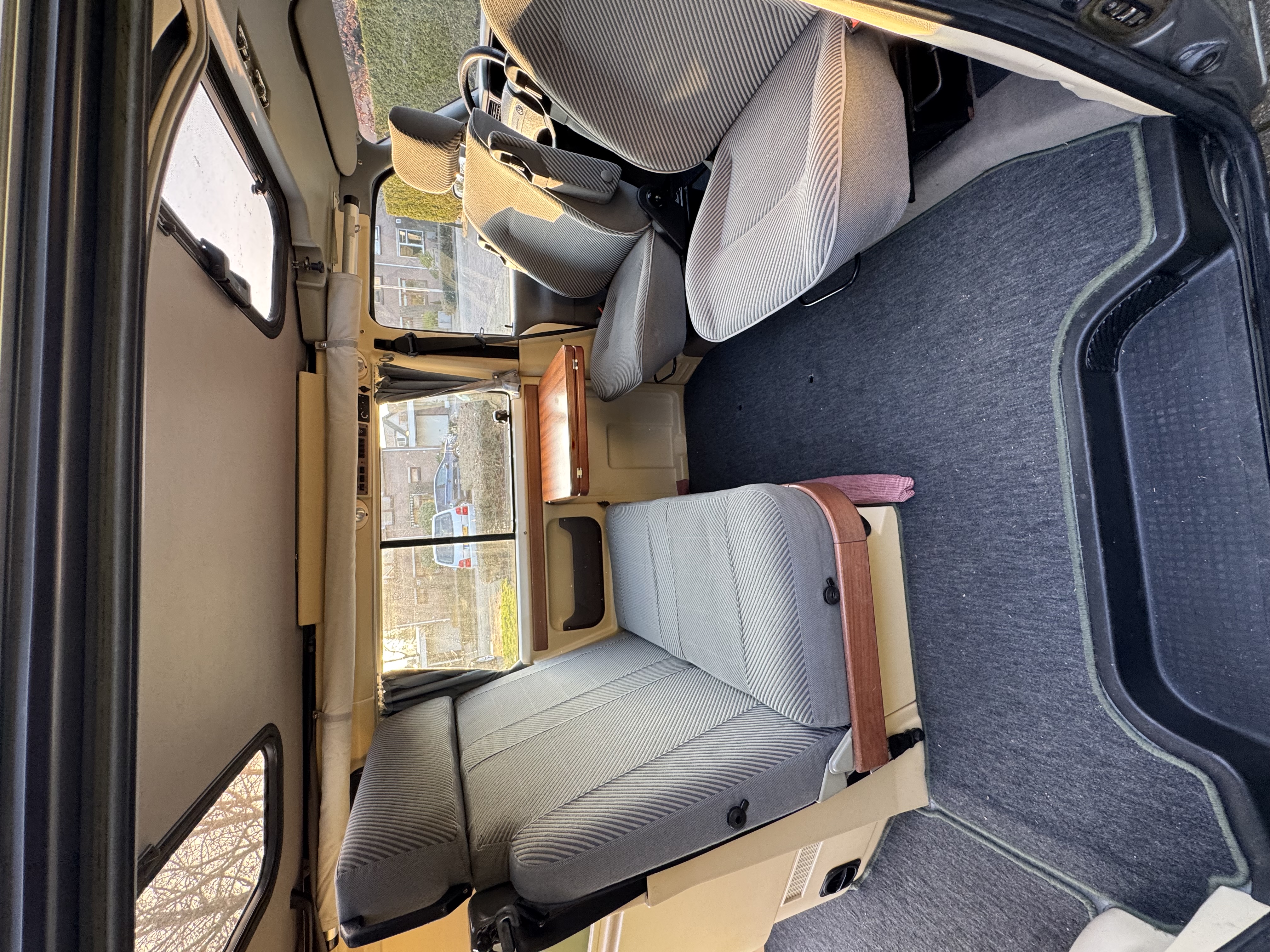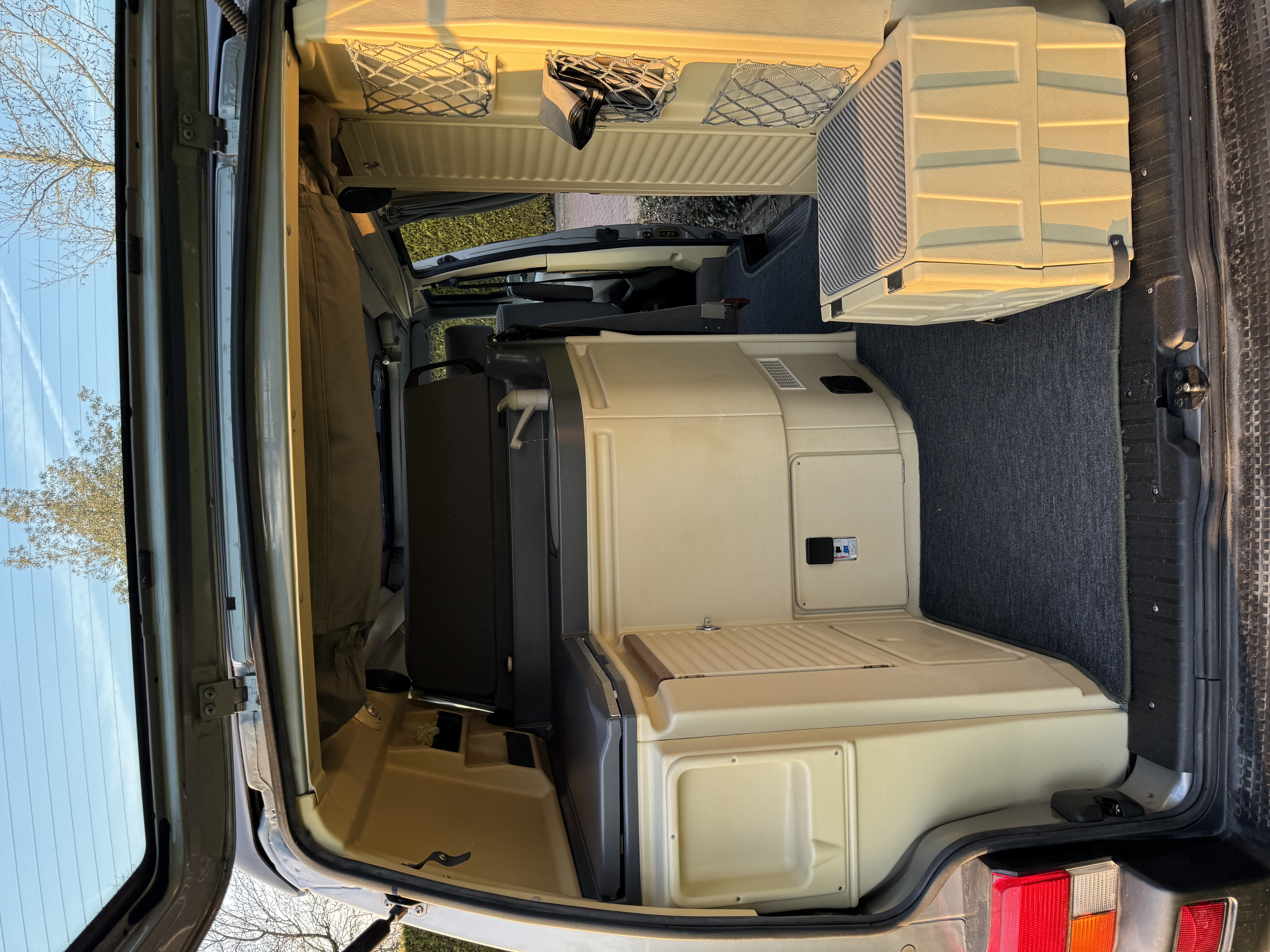 De Dehler heeft 4 zitplaatsen en je kunt er met 3 mensen in slapen. Doordat er geen plank in het hefdak zit heb je direct de vrije ruimte en is het ruimtelijker dan bijvoorbeeld een westfalia camper of nugget hierdoor mis je wel het bed en slaap je hier in een hangmat ongeveer tot 60/70 kg kan je hier prima in slapen.