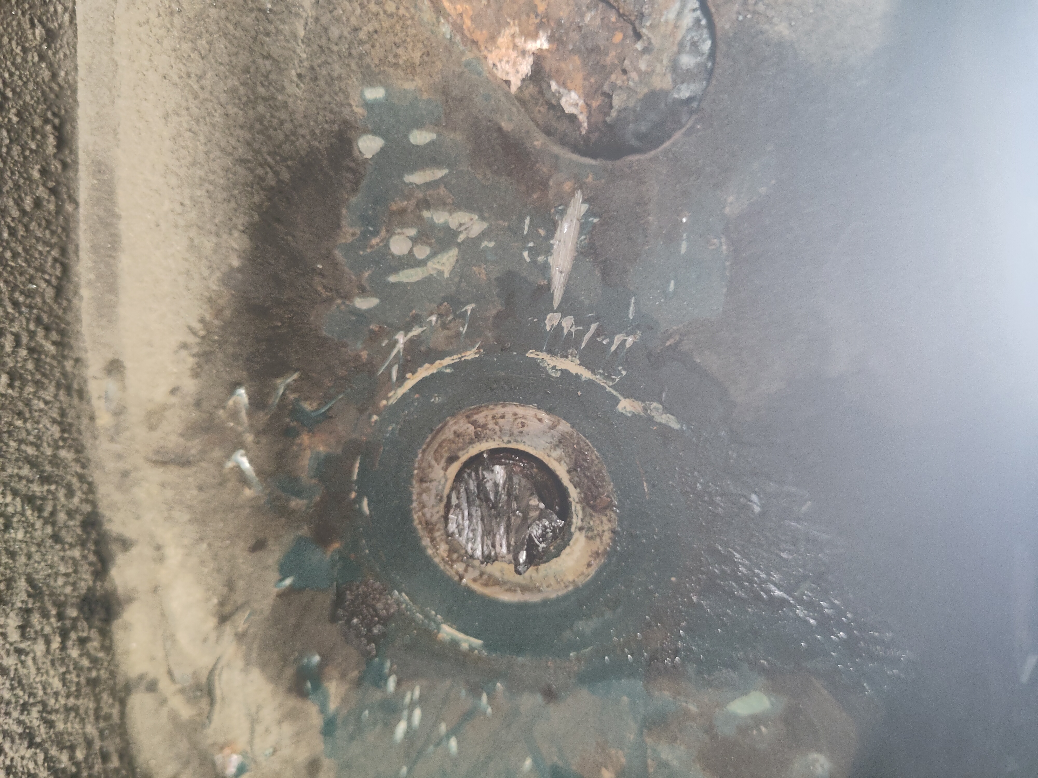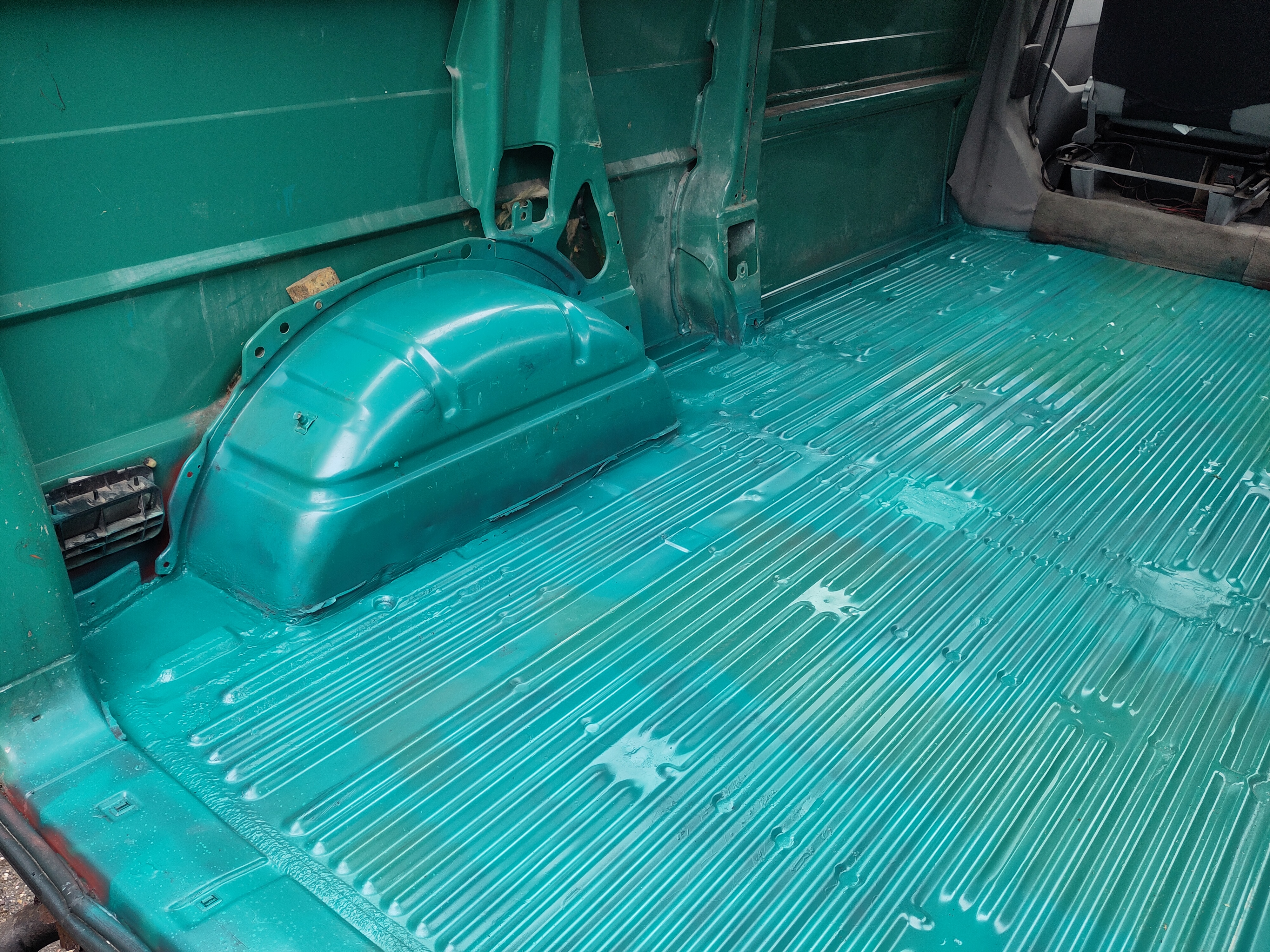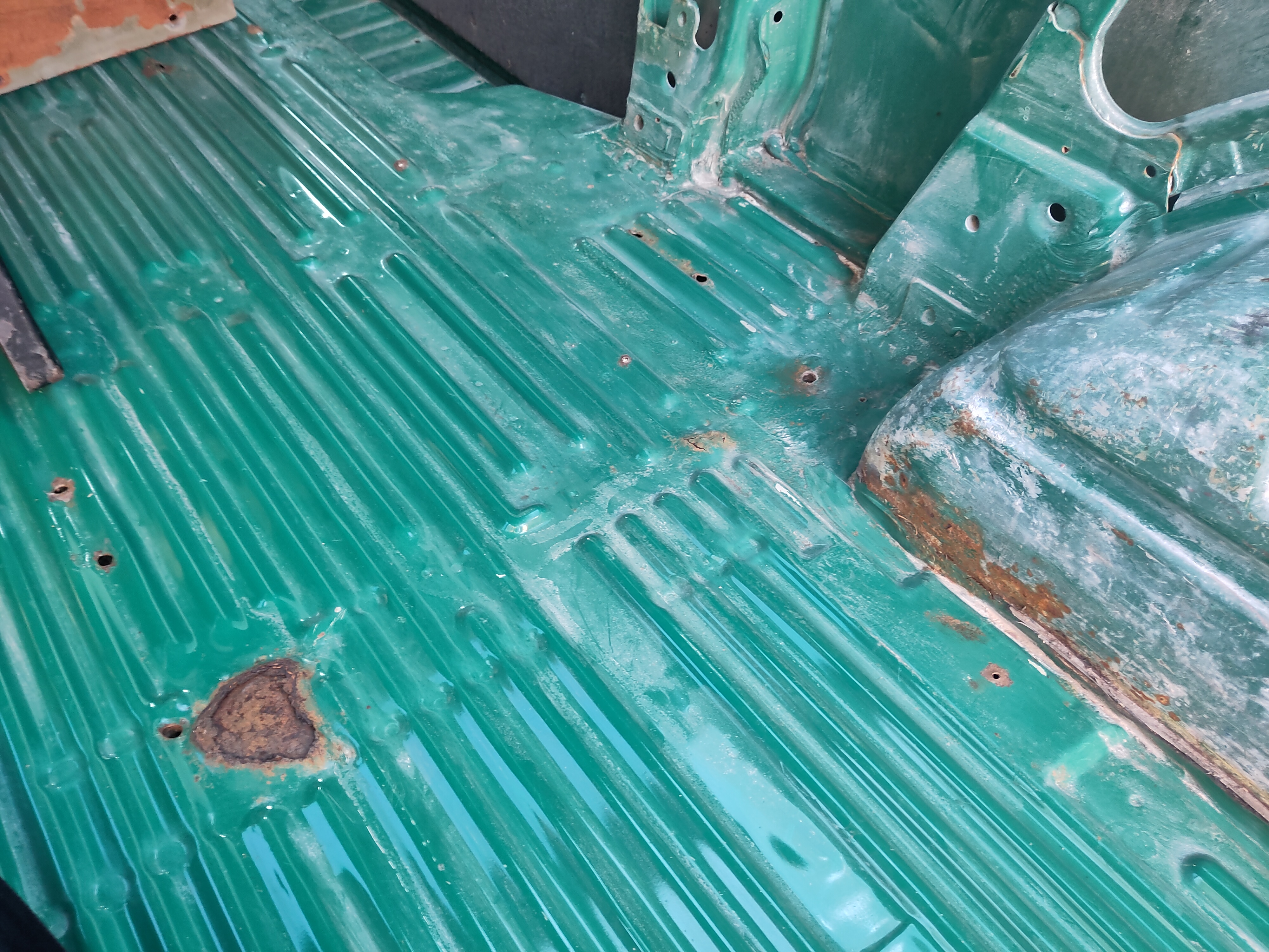 Net voor de achterwielen loopt overdwars een balk waar de wielarmen in scharnieren. Deze is ook goed roestig, te zien aan je foto (driehoekige donkere roestplek midden op de vloer). Bekende plek. Deze heb ik ooit door de garage laten conserveren en nieuwe stukjes er op laten lassen. Dit is een lastige plek om 100% op te lossen. Hier zitten namelijk 3-4 lagen metaal onder. (Conserveren en plaatje er over dus) Overigens, op diezelfde foto, de aansluiting van de wielbak op de vloer (bijrijderszijde) is door, of bijna door. Daar moet ook een nieuw stripje metaal in.