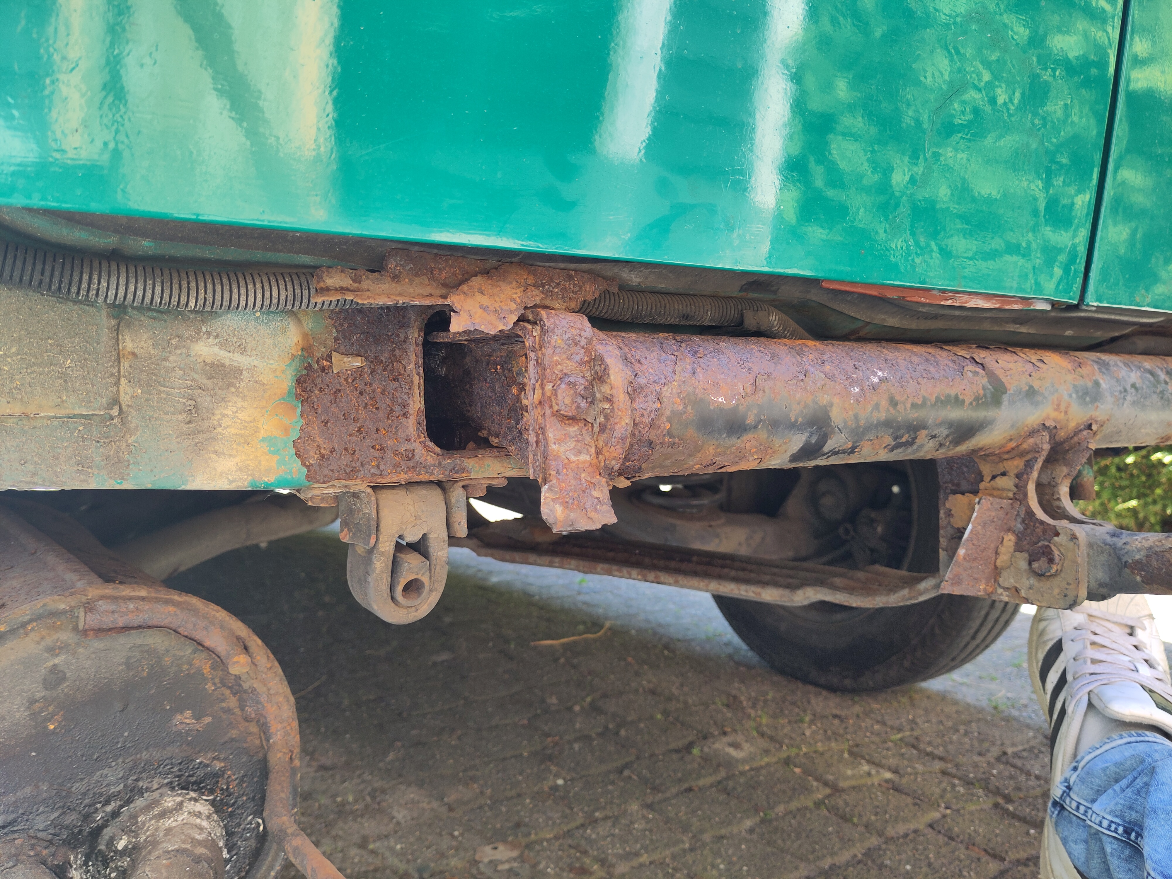 Ok nu heb ik wat hulp nodig. Ik heb de achterbumper eraf gehaald en kwam tot de conclusie dat de balk/binnen bumper waar de trekhaak aan vast zit wel erg verroest is. Omdat ik geen trekhaak nodig heb en na het verwijderen meer ruimte heb om de boel aan te pakken heb ik besloten de boel eronder vandaan te halen.