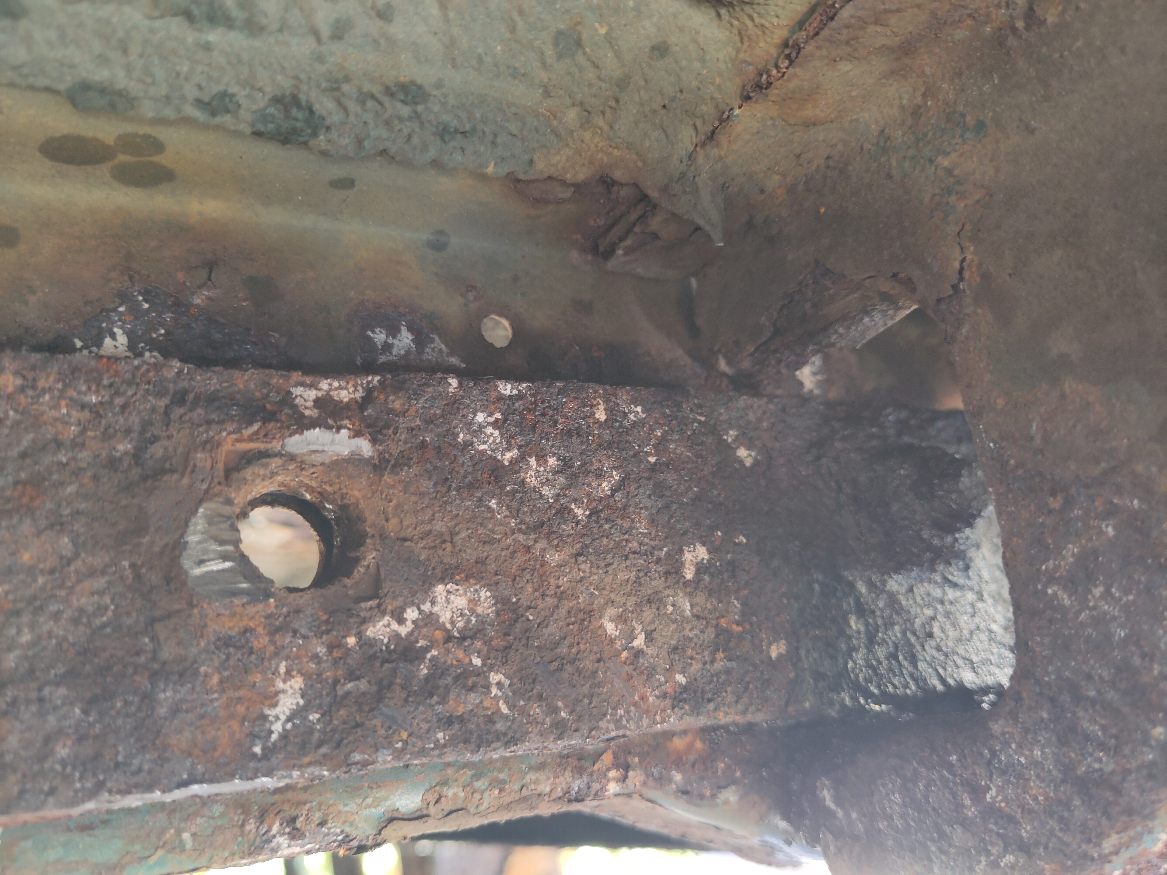 De balk is aan allebei de kanten met drie bouten aan de chassis balk vastgemaakt, vanwege het roest is de slijptol de enige optie maar nu kom ik erachter dat de moer met een kleine las is vastgezet, en dat op een plek waar ik bijna niet bij kan.