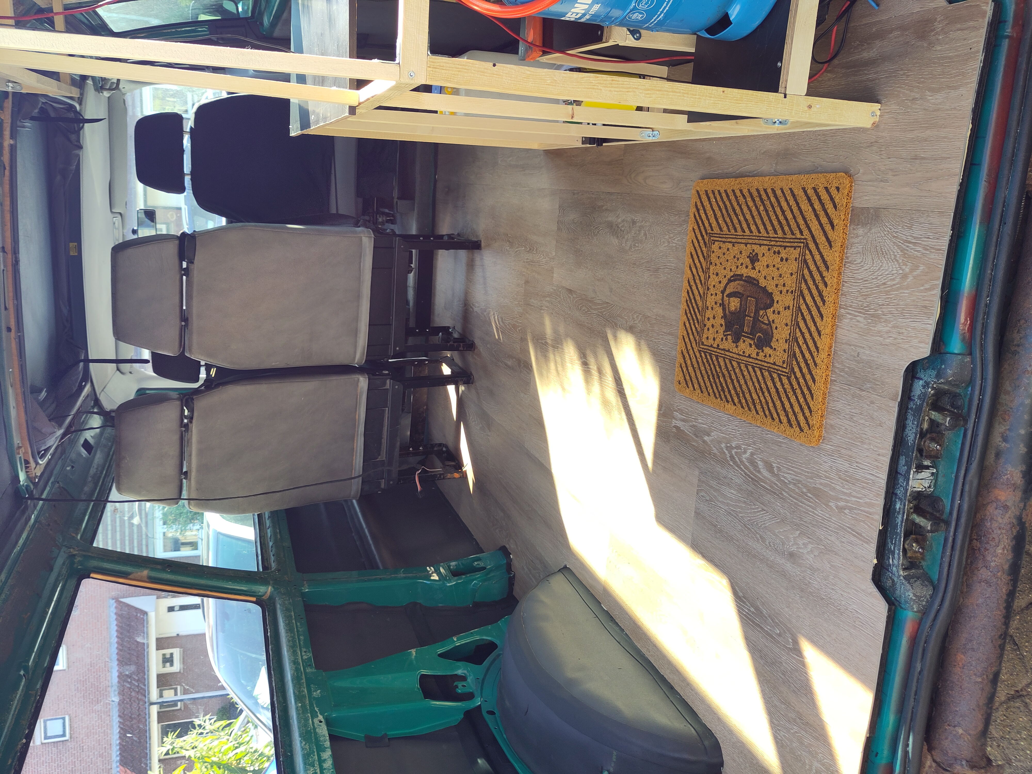 Vloer/wanden/plafond geïsoleerd, pvc-vloer erin, stoelen erbij gezet en een begin gemaakt aan de keuken.